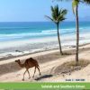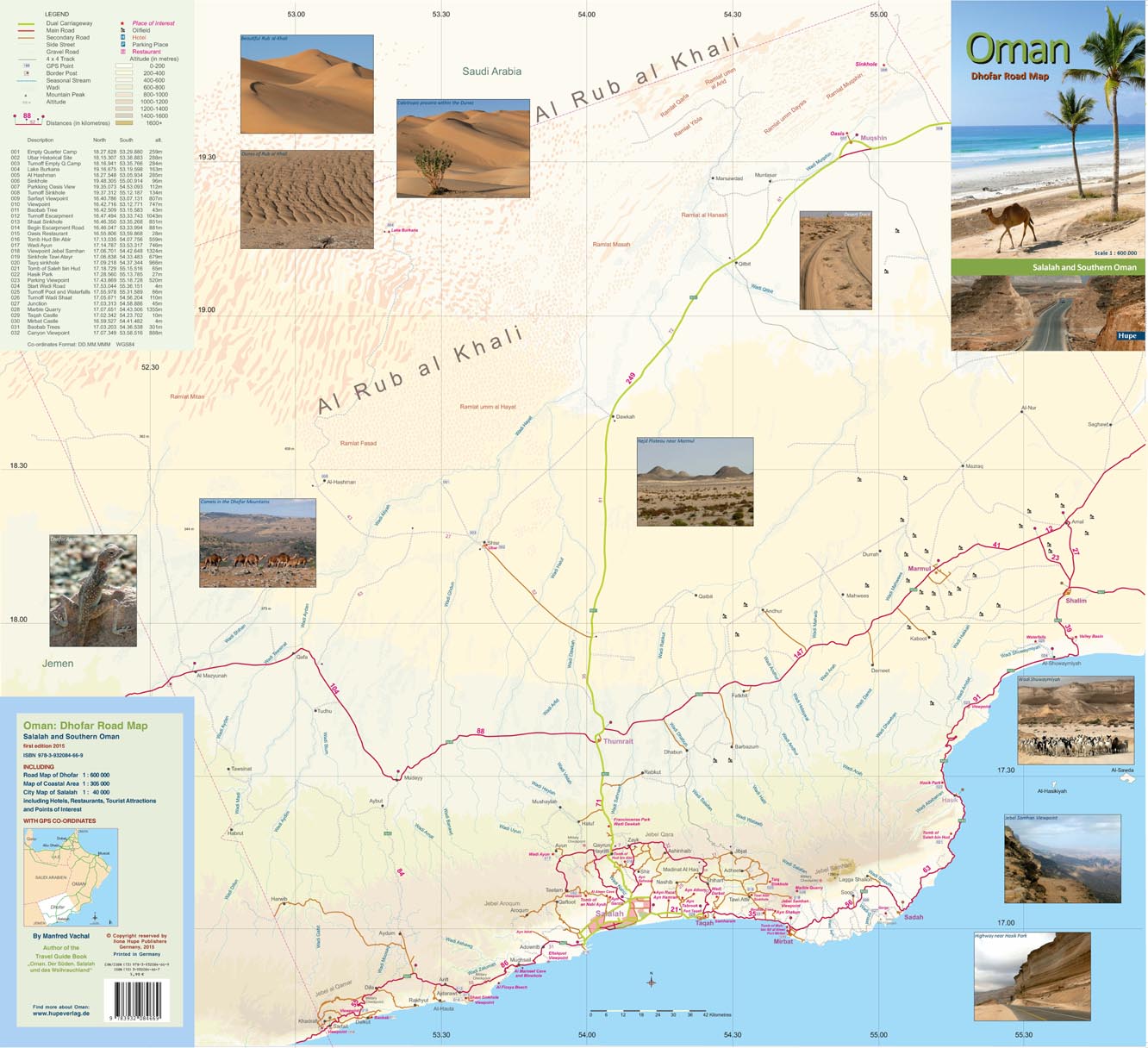 The Dhofar region of southern Oman on a road map at 1:600,000 from Hupe Verlag with GPS coordinates for 32 locations, plus on the reverse side an enlargement of the region’s coastal area, plus a street map of Salalah. On one side the Dhofar region is shown at 1:600,000 with coverage extending from the coast to the border with Saudi Arabia. Landscape is shown by altitude colouring with spot heights, wadis and names of main topographic features. Presentation of the road network indicates gravel roads and 4WD tracks, most with driving distances. The map shows various places of interest and locations of oil fields. 32 locations in the region, including viewpoints, oasis, historic buildings as well as camps or restaurants, are cross-reference to a table listing their GPS waypoints. Latitude and longitude lines are drawn at 30’ intervals. On the reverse, the coastal area between Rakhyut and the Tomb of Saleh bin Hud north-east of Sadah is presented in greater detail at 1:305,000. The reverse side also includes a street plan of Salalah, showing main roads and naming neighbourhoods and selected smaller streets. The plan indicates locations of hotels, restaurants and various places of interest. All place names are in the Latin alphabet only and, where appropriate including the map legend, in English.