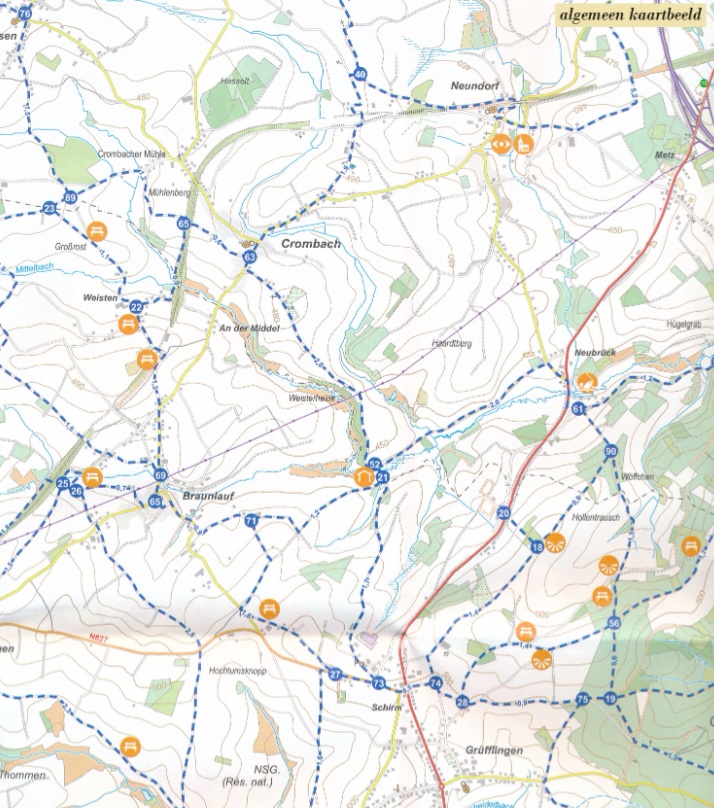 De tochten op deze wandelkaart zijn gebaseerd op het wandelknooppuntensysteem in de Oostkantons. Door de individuele knooppunten samen te voegen, kunt u een wandeling maken volgens uw eigen wensen. Het Ourdal in het Drielandenpunt België-Duitsland-Luxemburg - omvat de plaatjes Oudler, Reuland, Stoubach, Oberhausen, Ouren - 1/25.000