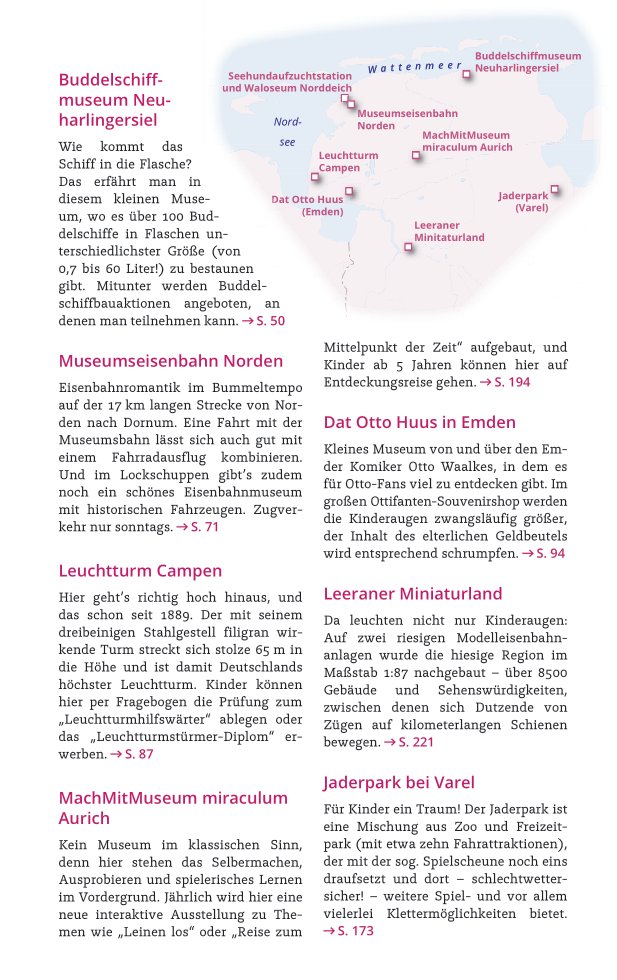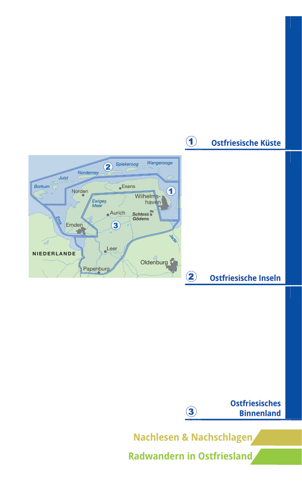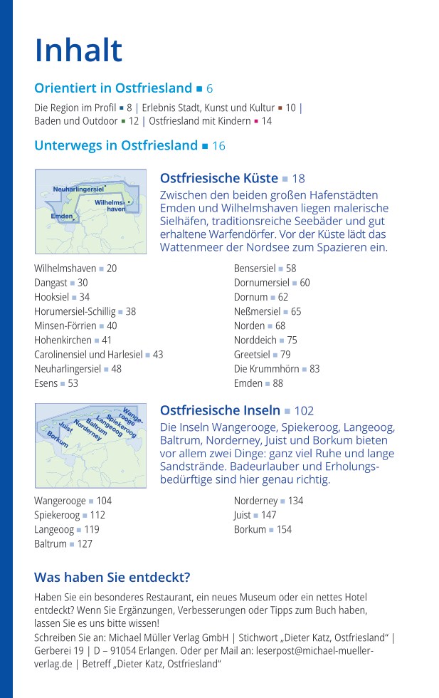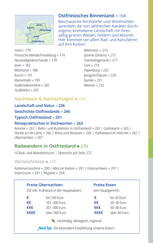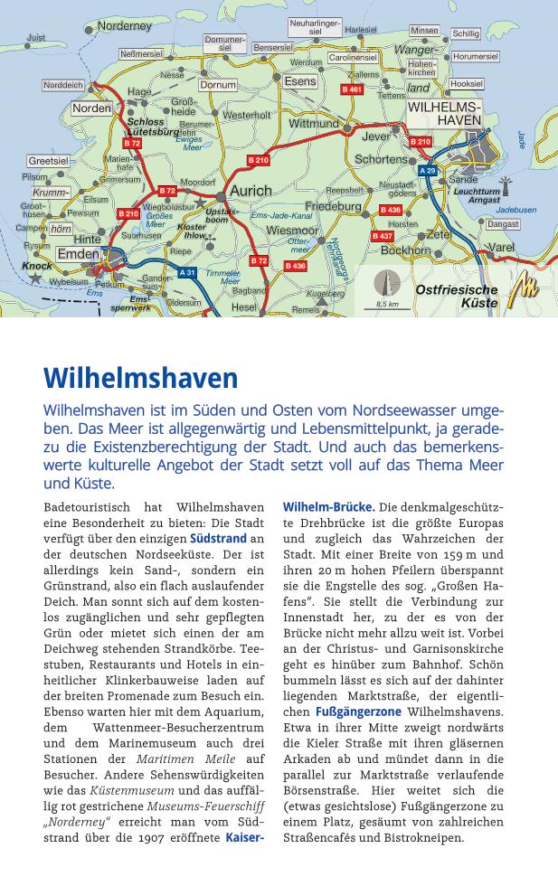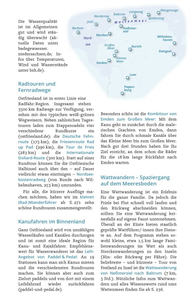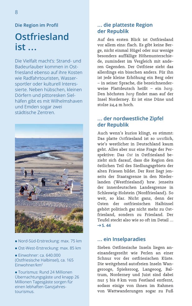 Infos zu allen Orten vom ostfriesischen Binnenland über die Küste bis hin zu den ostfriesischen Inseln: Der Ostfriesland-Reiseführer bietet ausführliche Informationen zur Geschichte und Natur der Region, verbunden mit zahlreichen reisepraktischen Tipps zu den zwei großen Hafenstädten Emden und Wilhelmshaven, der Bierstadt Jever, der Reederei-Stadt Papenburg, der Friesenstadt Aurich, der Seehafenstadt Leer und zu mehr als 100 weiteren Orten.