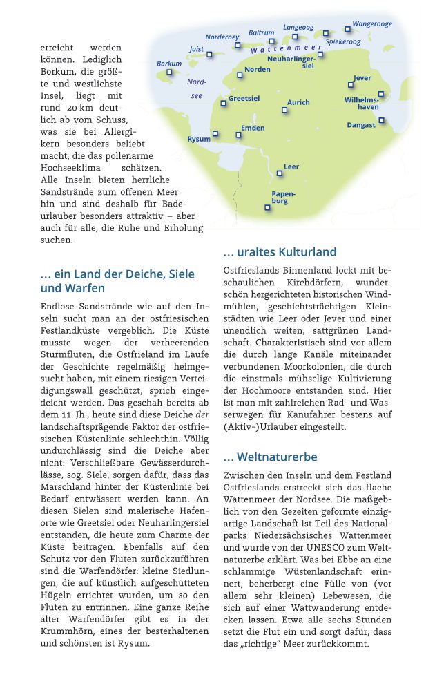 Deze uitgebreide en voortreffelijke gids biedt een ruime selectie goed doordachte reistips voor een vakantie naar Ostfriesland, gelardeerd met vele kleurenfoto’s overzichtskaarten en stadsplattegronden. Het bevat wandelingen en tips voor overige buitenactiviteiten. Het geeft daarnaast onderhoudende en informatieve achtergrondverhalen over land en volk. Tenslotte vindt u er weloverwogen selecties in, qua overnachtingsaccommodatie zoals hotels, bed & breakfast en campings en overige service-informatie.