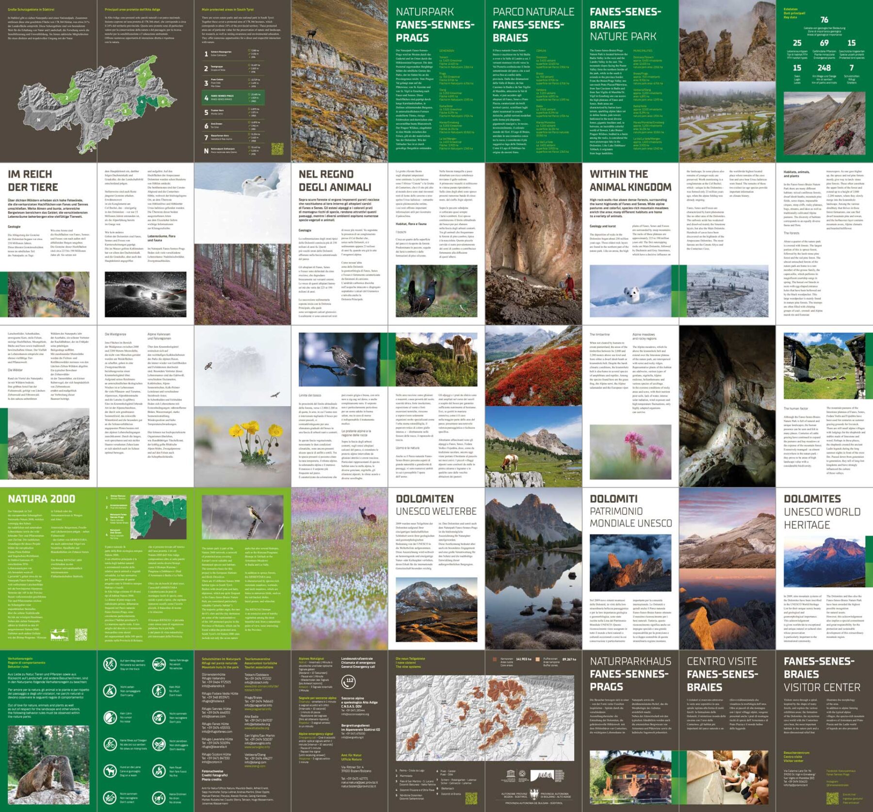 Fanes-Sennes-Prags Park territory map on one side, facts about the territory crossed on other side