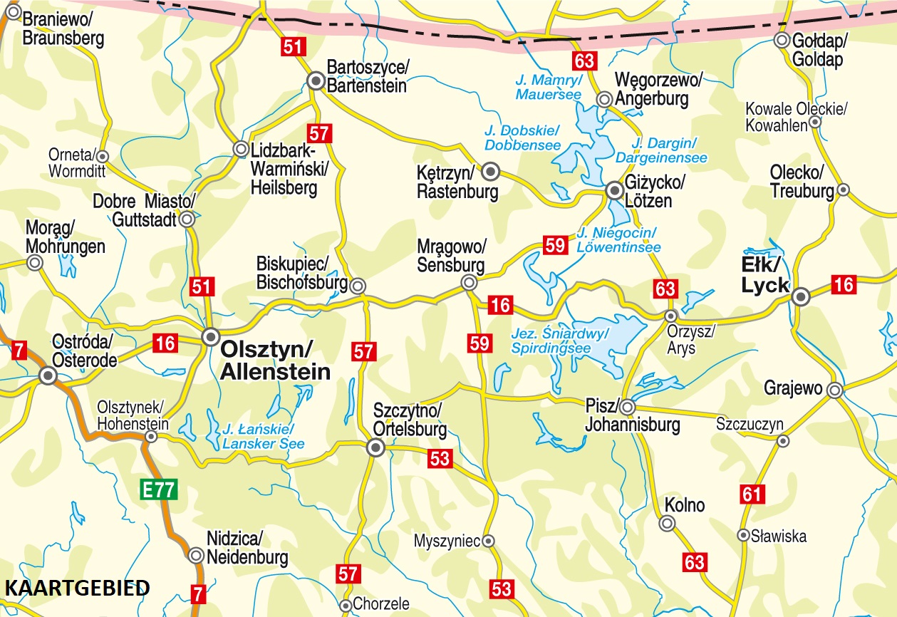 Kaarten en gidsen > Kaarten & plattegronden > Landkaarten en wegenkaarten > Europa > Centraal- en Oost-Europa, Balkan, Siberië > Polen > Noordoost-Polen met Mazurië > PL-010 Südliches Ostpreußen, wegenkaart Mazurië