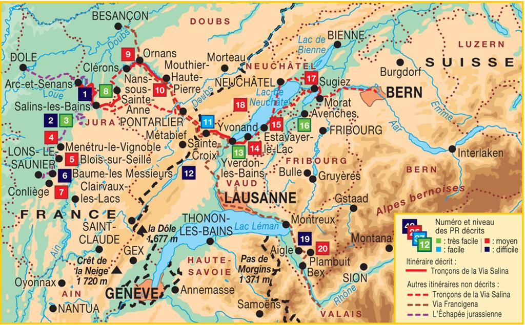 Terra Salina vous propose des outils modernes de randonnée pédestre et cyclable pour partir à la découverte des voies historiques du sel, de sites Unesco et de cités thermales franco-suisses. 20 balades et 90 km de GRP®. Entre Suisse et Franche-Comté, l'exploitation de "l'or blanc" a influencé le développement du commerce, l'architecture des villes et l'organisation du territoire.
