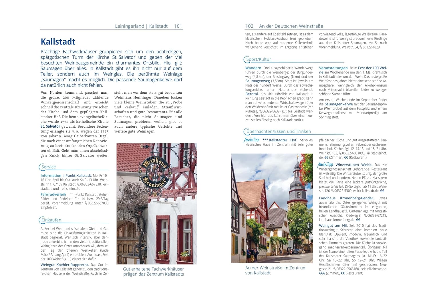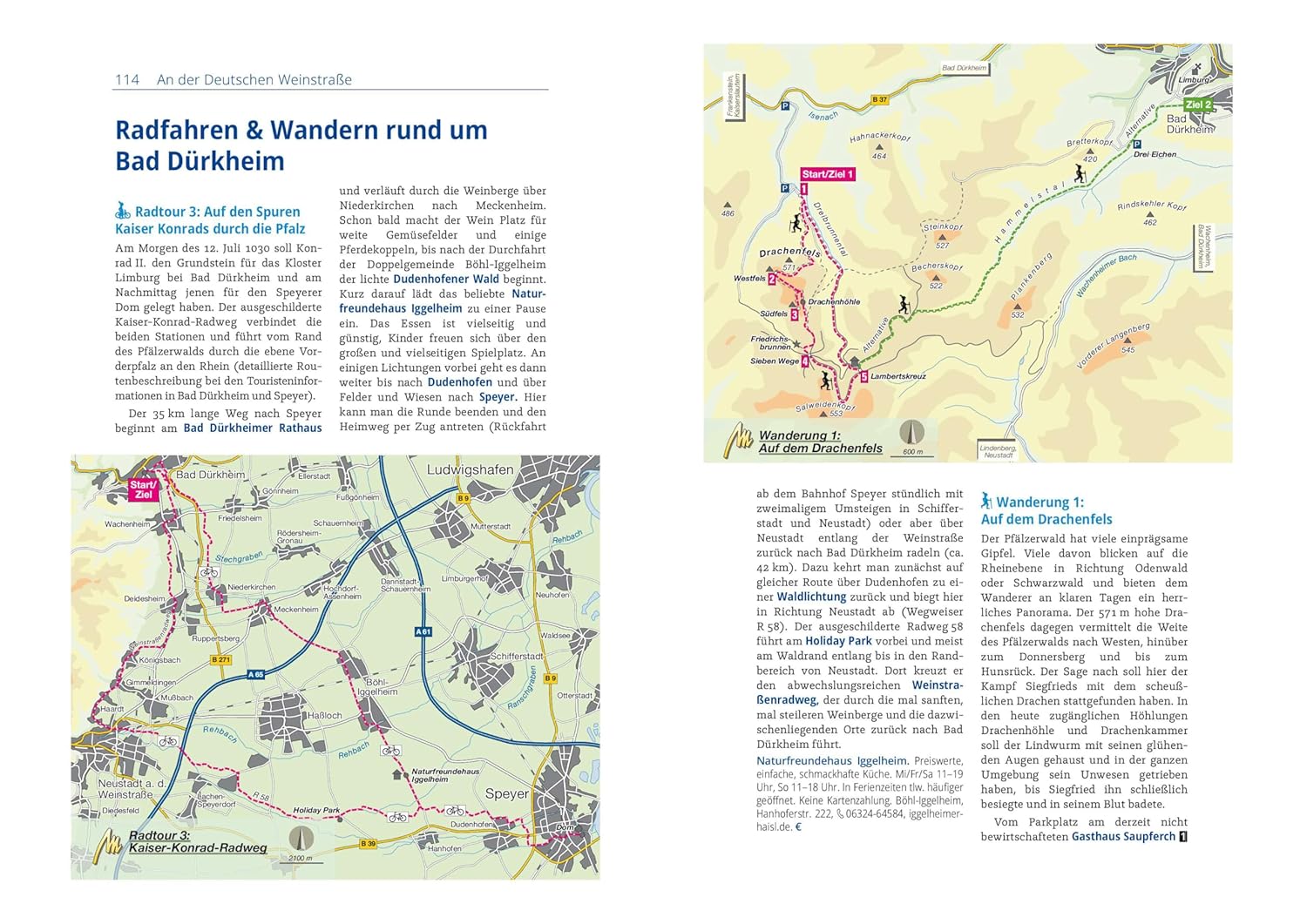 Een paradijs voor wijn- en wandelliefhebbers, voor fijnproevers en fietsers. Tussen de Rijn met de levendige domstad Speyer en het Dahner Felsenland in het Pfälzerwald loopt de Duitse wijnroute, waarlangs naast vrolijke wijnfeesten en schilderachtige wijnboerderijen veel geschiedenis te ontdekken valt. De talloze kastelen op de rotsen, zoals Trifels boven Annweiler, beheersten ooit het lot van het land; tegenwoordig zijn het prominente uitkijkpunten en spectaculaire avonturenspeelplaatsen voor kinderen. De geurige, met dennen begroeide zuidhellingen van het Pfälzerwald en de bladeren van de wijnstokken, die in de herfst in alle denkbare kleuren glanzen, zijn fantastisch.
