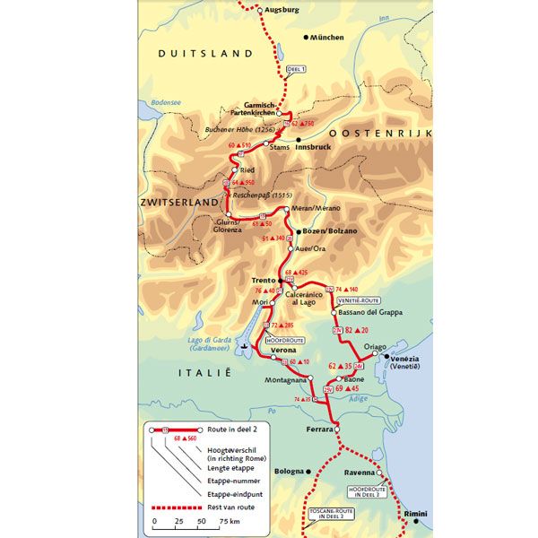 In Trento, de eerste echt Italiaanse stad op de route, kun je kiezen tussen de hoofdroute via Verona of de Venetië-route. Deze laatste is 74 km langer en heeft iets meer hoogteverschil. Bovendien is een route naar het Gardameer opgenomen in de nieuwe druk van deel 2.