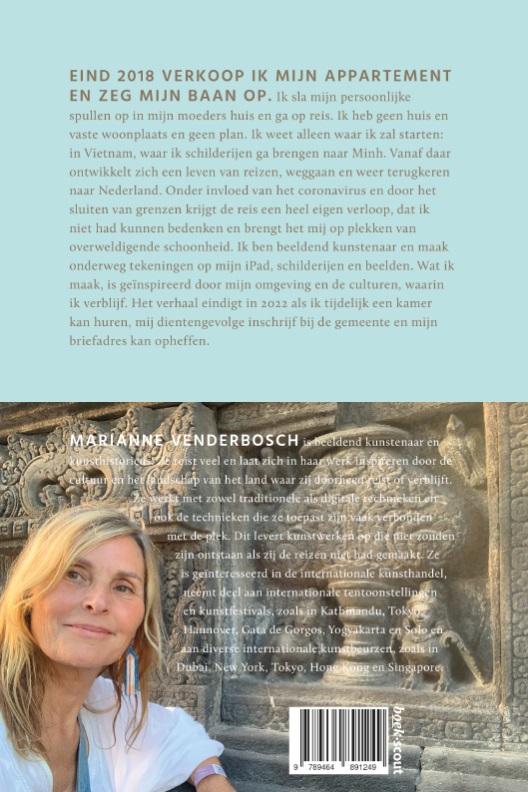 Eind 2018 verkoop ik mijn appartement en zeg mijn baan op. Ik sla mijn persoonlijke spullen op in mijn moeders huis en ga op reis. Ik heb geen huis en vaste woonplaats en geen plan. Ik weet alleen waar ik zal starten: in Vietnam, waar ik schilderijen ga brengen naar Minh. Vanaf daar ontwikkelt zich een leven van reizen, weggaan en weer terugkeren naar Nederland. Onder invloed van het coronavirus en door het sluiten van grenzen krijgt de reis een heel eigen verloop, dat ik niet had kunnen bedenken en brengt het mij op plekken van overweldigende schoonheid. Ik ben beeldend kunstenaar en maak onderweg tekeningen op mijn iPad, schilderijen en beelden. Wat ik maak, is geïnspireerd door mijn omgeving en de culturen, waarin ik verblijf. Het verhaal eindigt in 2022 als ik tijdelijk een kamer kan huren, mij dientengevolge inschrijf bij de gemeente en mijn briefadres kan opheffen.