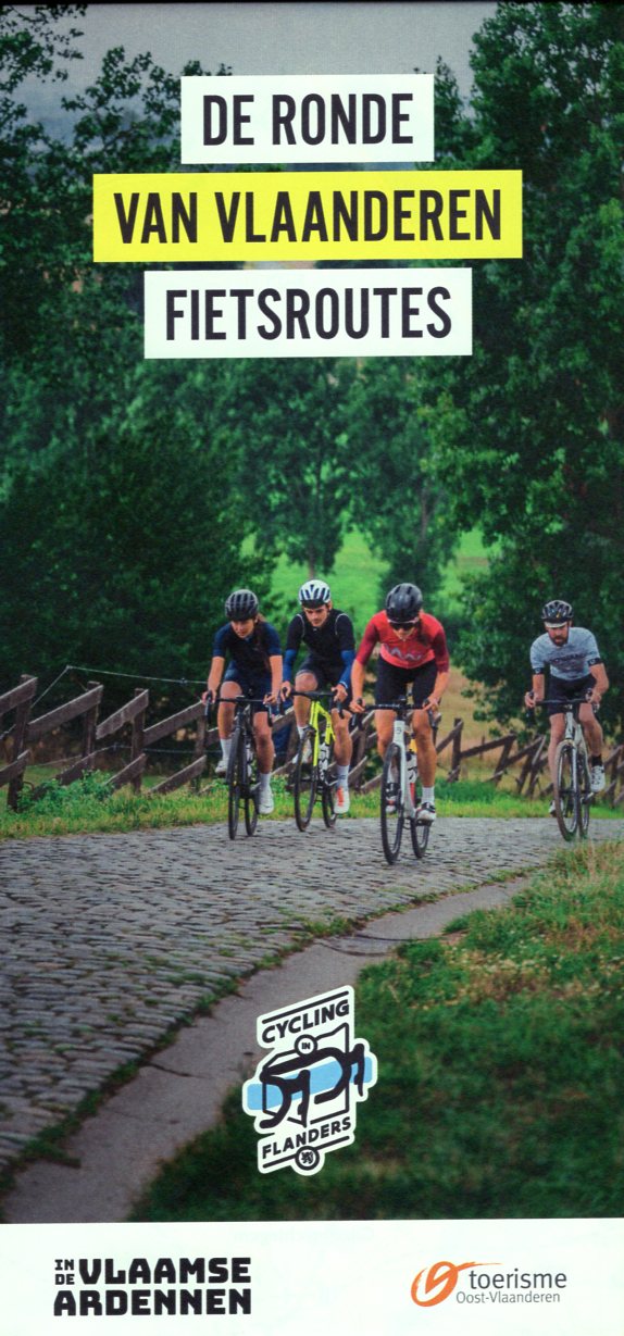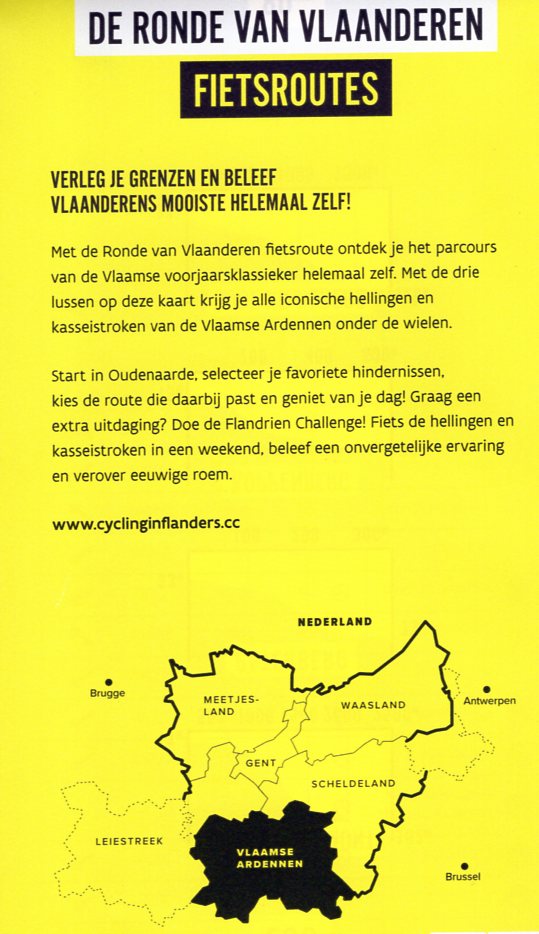 Deze handige fietskaart op watervast papier werd ontwikkeld door Toerisme Oost-Vlaanderen ism o.a. het Centrum Ronde van Vlaanderen en de organisator van de Ronde van Vlaanderen. Er is de keuze uit 3 lussen van resp. 78 (blauw), 114 (rood) of 103 km (geel) die met bordjes in dezelfde kleur zijn aangeduid en waarin alle mythische hellingen zijn opgenomen. Past zo in de achterzak van het koersshirt.