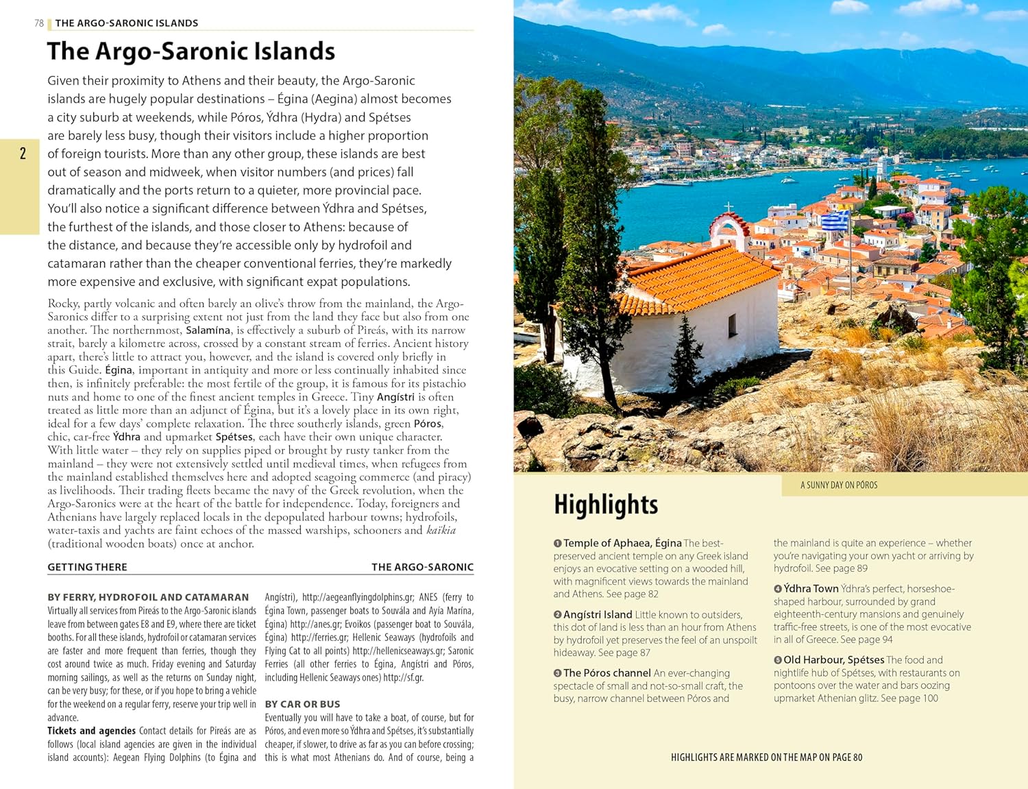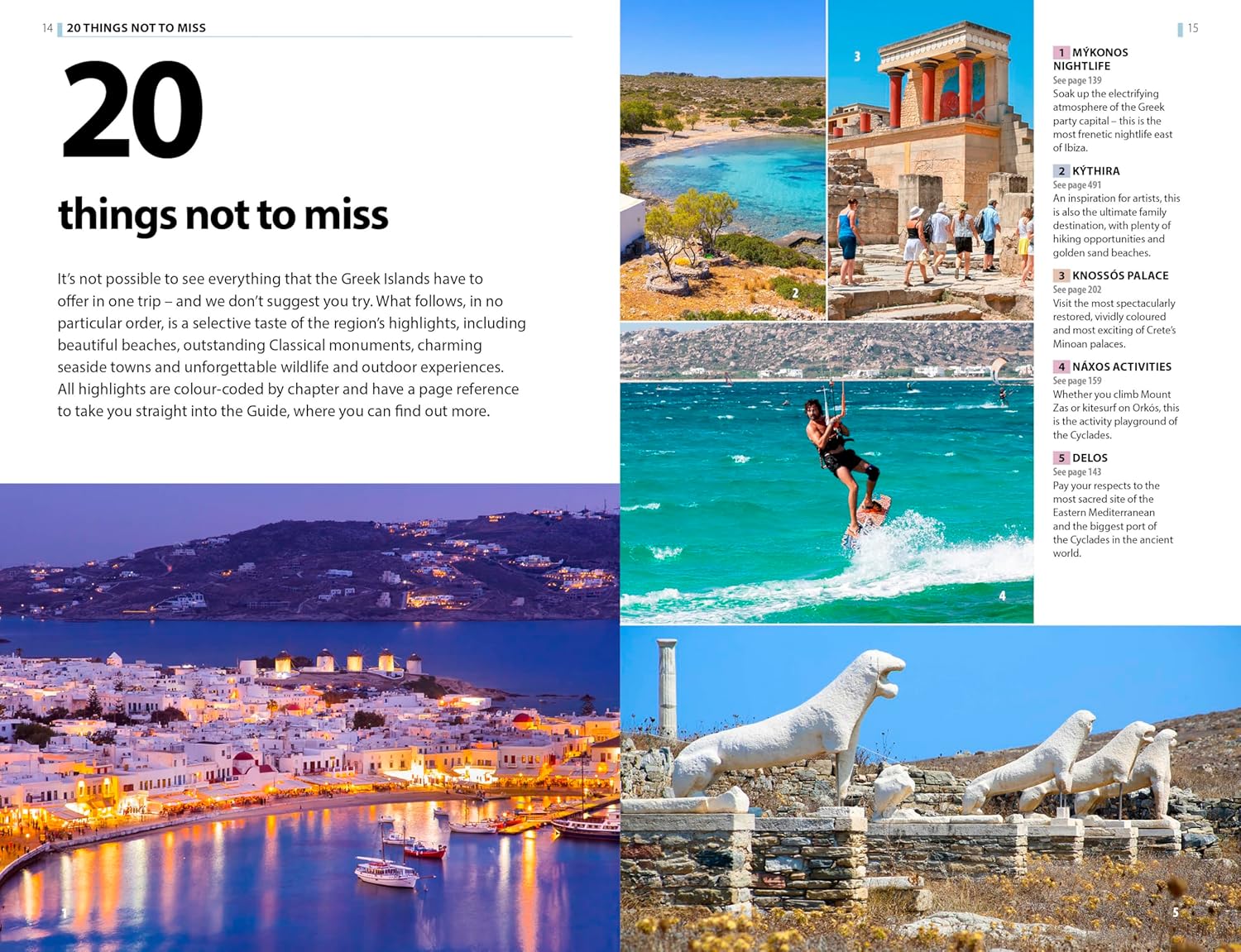Areas covered include: Athens and the mainland ports, the Argo-Saronic Islands, the Cyclades, Crete, the Dodecanese, the East and North Aegean islands, the Sporades and Évvia, the Ionian Islands. Attractions include: the Acropolis, Knossós Palace (Crete), Kálymnos cliffs, Delos (Cyclades), Church of Ekatondapylianí (Páros), Samariá Gorge (Crete), Ólymbos village (Kárpathos), Shipwreck Bay (Zákynthos), Melissáni Cave (Kefaloniá), Monastery of St John (Pátmos), Sými harbour, and many more.