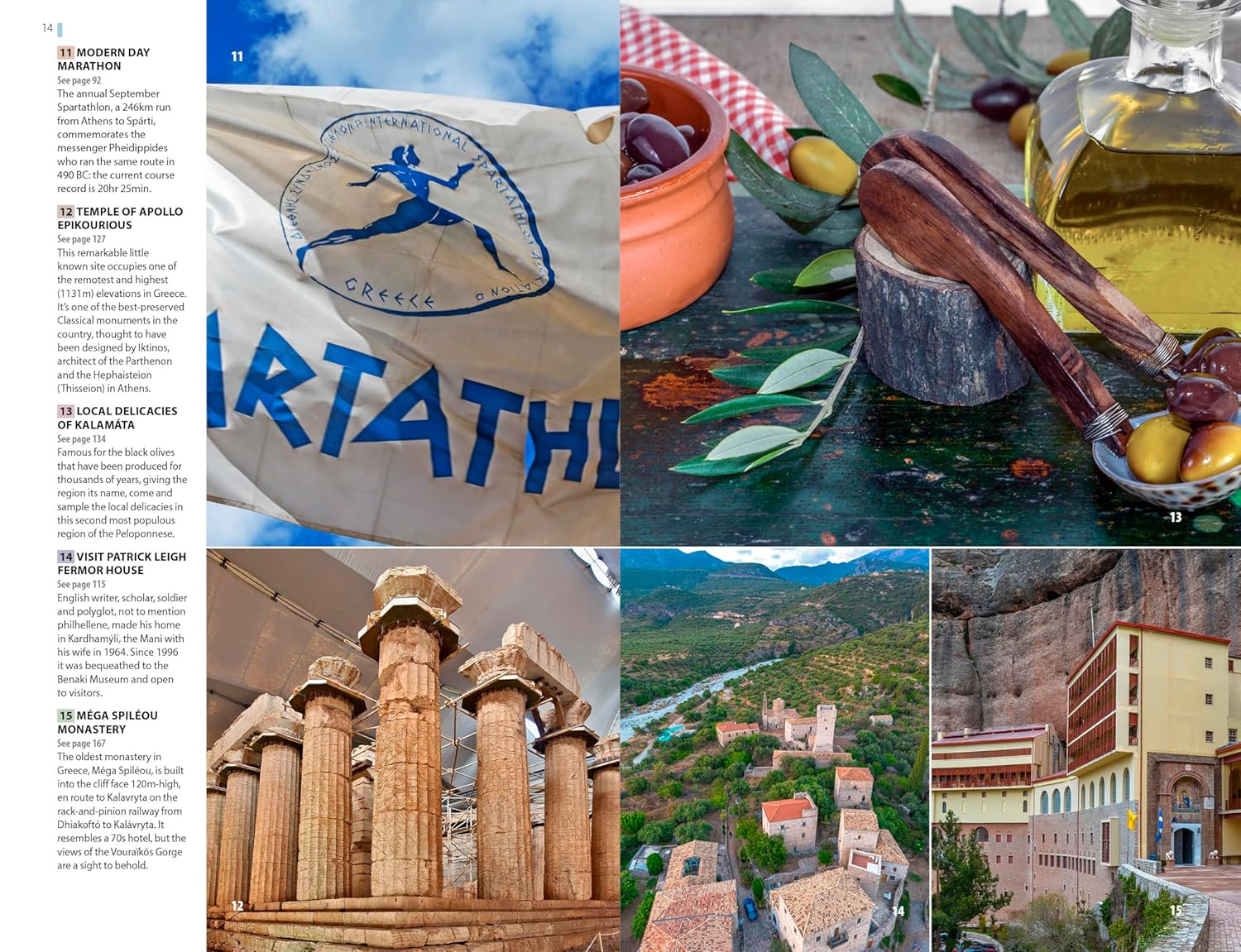 - 'Must-See' selectie – een samengestelde selectie van bezienswaardigheden die je niet mag missen, gekozen door onze auteurs: Náfplio, Epidaurus, Monemvasiá, Mystra, de Máni, de Messenische Kust, Olympia, het oude Korinthe, de Citadel van Mycenae, het fort van Tiryns, Palamìdhi.