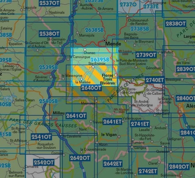 Dit is een deel uit de vernieuwde Série Bleue. Dat zijn zeer gedetailleerde topografische kaarten, met nauwkeurige registratie van onder meer (wandel)paden, hoogtelijnen en vele overige landschapselementen. Prima om mee te wandelen, ieder boerenstalletje staat erop! Wij doen de kaart in een transparant plastic hoesje (ook handig voor in de rugzak of tijdens het wandelen) en we stoppen er een door ons samengestelde Frans-Nederlandse wandelwoordenlijst (ca. 500 woorden) in.