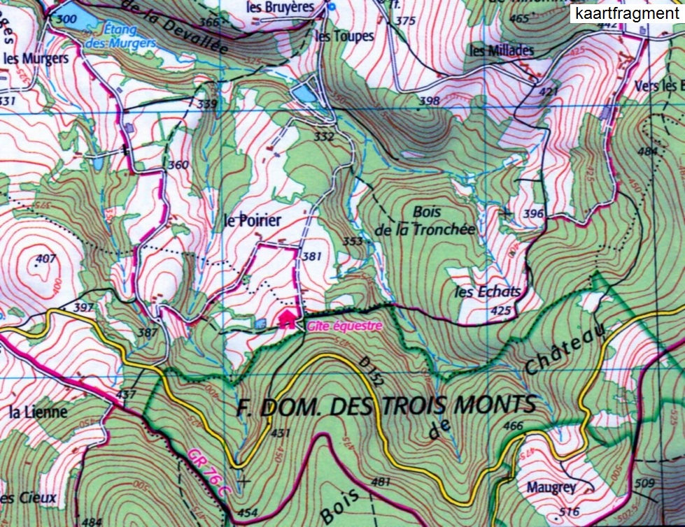 Dit is een deel uit de vernieuwde Série Bleue. Dat zijn zeer gedetailleerde topografische kaarten, met nauwkeurige registratie van onder meer (wandel)paden, hoogtelijnen en vele overige landschapselementen. Prima om mee te wandelen, ieder boerenstalletje staat erop! Wij doen de kaart in een transparant plastic hoesje (ook handig voor in de rugzak of tijdens het wandelen) en we stoppen er een door ons samengestelde Frans-Nederlandse wandelwoordenlijst (ca. 500 woorden) in.