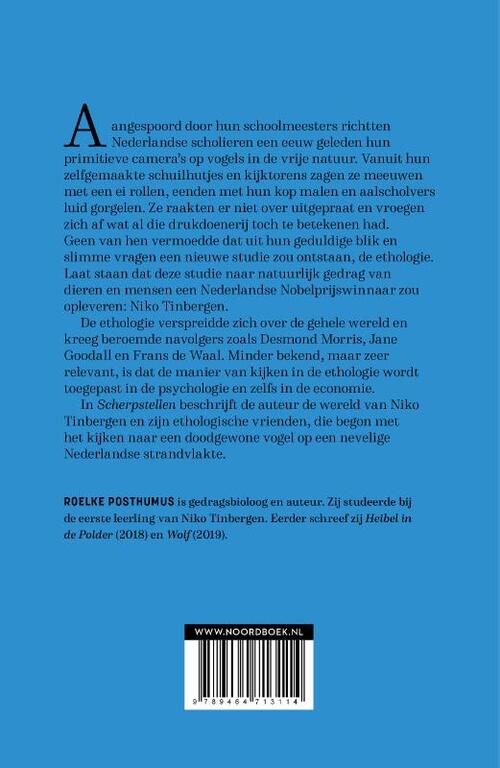 Ethologie is een typisch Nederlands fenomeen, dat zich verspreidde over de gehele wereld en beroemde navolgers heeft voortgebracht, zoals Jane Goodall, Frans de Waal, Adriaan Kortlandt en vele anderen. Minder bekend, maar zeer relevant, is dat de manier van kijken in de ethologie gemeengoed is geworden in de psychologie. In Scherpstellen beschrijft de auteur de wereld van Niko Tinbergen en zijn ethologische vrienden, die begon met het kijken naar een doodgewone vogel op een nevelige Nederlandse strandvlakte. Roelke Posthumus is gedragsbioloog en auteur. Zij behoorde tot de eerste leerlingen van Niko Tinbergen. Eerder schreef zij Heibel in de Polder (2018) en Wolf (2019).