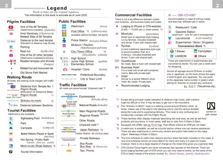 De kaart is ontworpen om zo gebruiksvriendelijk mogelijk te zijn voor internationale pelgrims. Hij bevat alle essentiële informatie die je nodig hebt, zoals de locaties van de 88 tempels, openbare toiletten, accommodaties, rustplaatsen, supermarkten, postkantoren, en haltes voor openbaar vervoer. Bovendien worden de afstanden nauwkeurig weergegeven.