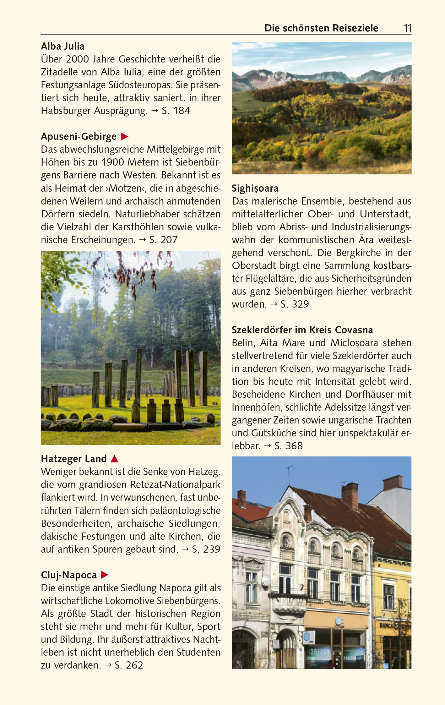 Siebenbürgen, das sagenumwobene Transsilvanien, ist die bekannteste Region Rumäniens und gilt als Heimat des legendären Grafen Dracula. Rumänische, ungarische und deutsche Traditionen vermischen sich hier seit Jahrhunderten, wovon die vielen pittoresken Städte und Dörfer Zeugnis ablegen. In den lebendigen Städten Bra?ov (Kronstadt), Sibiu (Hermannstadt) und Sighi?oara (Schäßburg) haben vor allem die Siebenbürger Sachsen ihre Spuren hinterlassen. Auf dem Land locken unzähligen Kirchenburgen und Burgruinen, viele davon UNESCO-Welterbe. Die Ausgrabung Sarmizegetusa Regia zeugt von den Spuren der Daker und Römer in Rumänien. Industriekultur lässt sich im Siebenbürgischen Erzgebirge erleben.