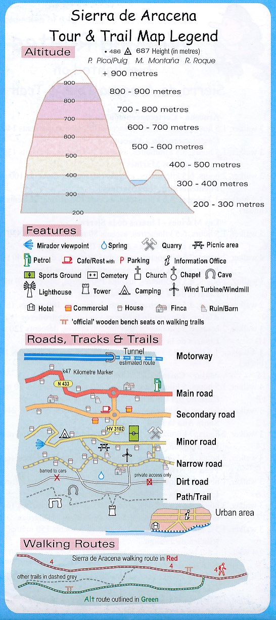 Wandelkaart van de Sierra de Aracena, in het westen van Andalusië. Met hoogtelijnen en routes. | 1:40,000 scale topographical map covering the Sierra de Aracena region in northern Huelva/Andalucia. All walking routes from Sierra de Aracena - a Walk! Guidebook; are clearly highlighted. Discover the hidden Spain of western Andalucia which is a delight for leisure walkers who appreciate the natural world and 1st class culinary delights; the Jabugo pata negra ham and local setas make for a unique dining experience. 2nd edition includes 1 minute Lat/Long grid, road and development updates and specially highlighted walking trails. Sierra de Aracena Tour & Trail Custom Map is available as a free digital download from Discovery Walking Guides website dwgwalking.co.uk for use in Garmin gps units, Garmin Basecamp and Google Earth; see details on the map for the free digital download. Digital editions of this map are available for use on mobile phone apps from Viewranger and MyTrails. Produced to Tour & Trail standards resulting in a map of outstanding accuracy and clarity. Whether you are driving, walking, hiking, horse riding or mountain biking this is the map to carry with you.