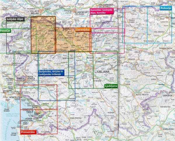 Gedetailleerde wandelkaart van Slovenie met gemarkeerde wandelpaden en langeafstandswandelingen ingetekend op de kaart). Verder toeristische informatie zoals musea, skigebieden, bushalteplaatsen, hotels, kampeerterreinen en berghutten. Dubbelzijdige kaart. Hoogtelijnen in 20 meter afstand. Met huttenlijst. Bij de kaart is een toeristisch gidsje gevoegd (Engels en Sloveens) met informatie over plaatsen en toeristische attracties, en beschrijving van wandel-en fietstochten met hoogteprofielen.