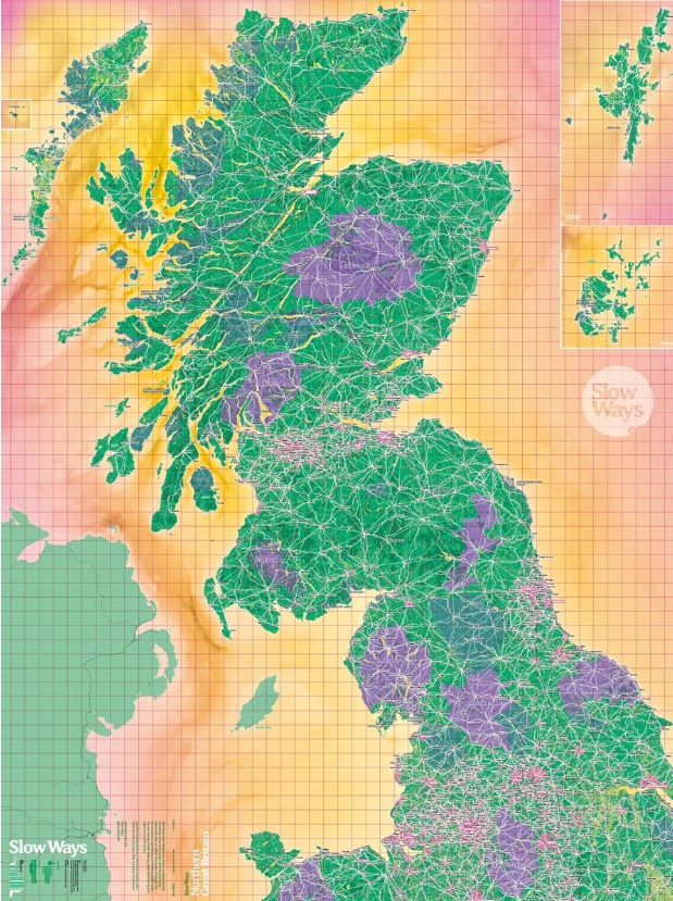 The map will be great for: imagining; planning journeys; drawing on; using as a companion to the website; marking Slow Ways you plan to walk; recording routes you have walked; learning about active travel in schools; making walls look fantastic! It is a two-sided giant, colourful and functional map. Slow Ways is an initiative to create a network of walking routes that connect all of Great Britain's towns and cities as well as thousands of villages and every national park. People can use the routes to walk between neighbouring places or combine routes to travel over longer distances.