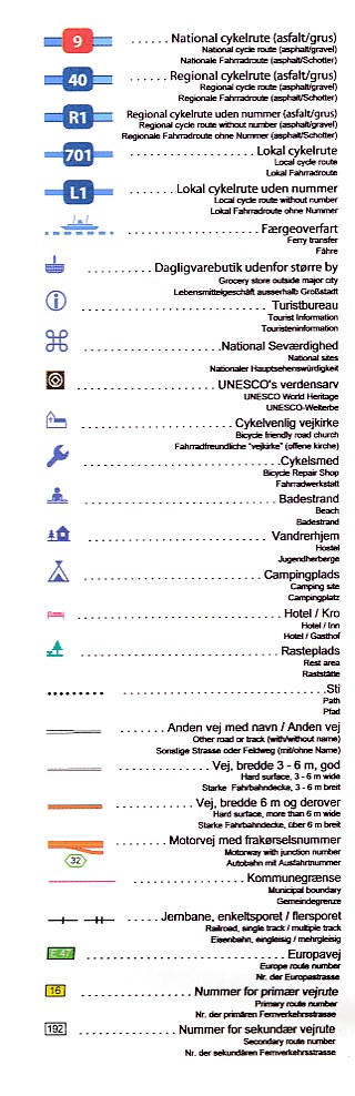 Mooie, scheur- en watervaste fietskaarten van Denemarken, met zowel de Nationale Fietsroutes als de lokale routes ingetekend. De kaarten bevatten algemene informatie over overnachtingsmogelijkheden, fietsvervoer op de trein enz. Ook d.m.v. informatieve icoontjes op de kaarten, zoals winkels (buiten de grote steden), UNESCO werelderfgoed, fietswinkels, stranden, campings, hotels, jeugdherbergen en veerboten. Legenda in Deens, Duits en Engels.