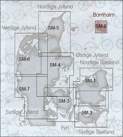 Mooie, scheur- en watervaste fietskaarten van Denemarken, met zowel de Nationale Fietsroutes als de lokale routes ingetekend. De kaarten bevatten algemene informatie over overnachtingsmogelijkheden, fietsvervoer op de trein enz. Ook d.m.v. informatieve icoontjes op de kaarten, zoals winkels (buiten de grote steden), UNESCO werelderfgoed, fietswinkels, stranden, campings, hotels, jeugdherbergen en veerboten. Legenda in Deens, Duits en Engels.