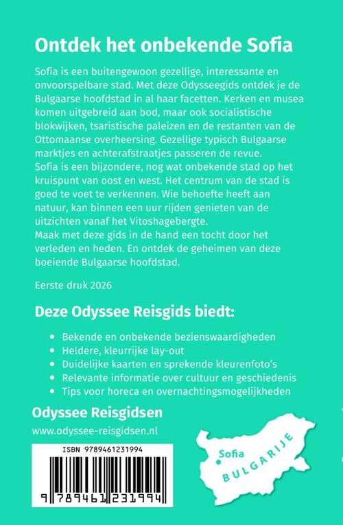 Sofia is een buitengewoon gezellige, interessante en onvoorspelbare stad. Met deze Odyssee-gids ontdek je de Bulgaarse hoofdstad in al haar facetten. Kerken en musea komen uitgebreid aan bod, maar ook socialistische blokwijken, tsaristische paleizen en de restanten van de Ottomaanse overheersing. Gezellige typisch Bulgaarse marktjes en achterafstraatjes passeren de revue. Sofia is een bijzondere, nog wat onbekende stad op het kruispunt van oost en west. Het centrum van de stad is goed te voet te verkennen. Wie behoefte heeft aan natuur, kan binnen een uur rijden genieten van de uitzichten vanaf het Vitoshagebergte.