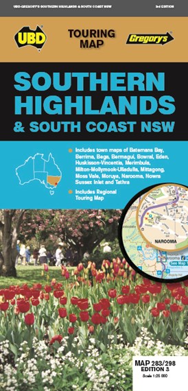 There is also street level mapping and indexes at a scale of 1: 25 000 for the towns of Batemans Bay Mogo, Milton Mollymook Ulladulla and Nowra and street level mapping at a scale of 1: 25 000 for the towns of Bega, Berrima, Bowral, Eden, Huskisson Vincentia, Merimbula, Mittagong, Moruya, Moss Vale, Narooma, Sussex Inlet & Tathra. There is also a list of regional touring attractions and advertisers.