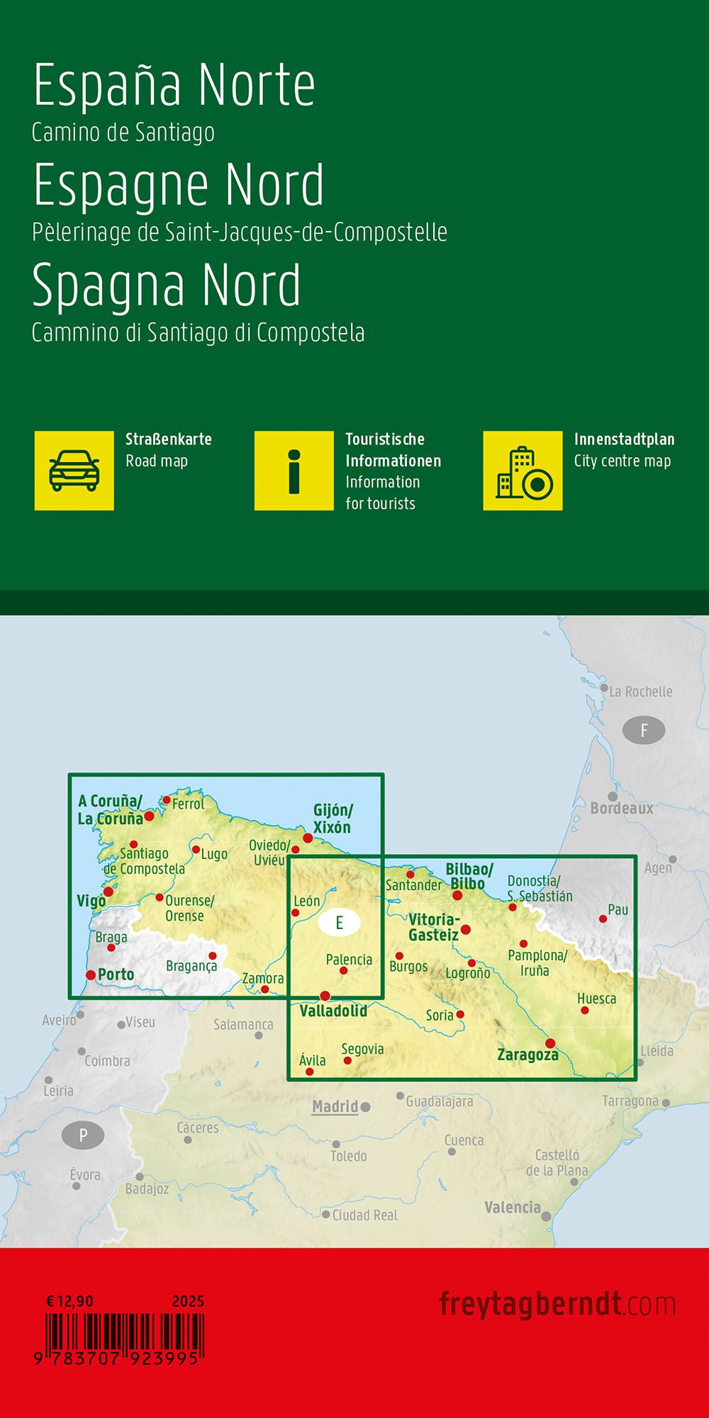 Ontdek het noorden van Spanje met deze wegenkaart van Freytag & Berndt. De beste kaart voor het plannen van uw reis en om ter plekke te gebruiken. Op deze kaart is de pelgrimsroute naar Santiago de Compostella, de bedevaart route naar het graf van Sint Jacobus, aangegeven, die van St-Jean-Pied-de-Port naar Santiago de Compostella loopt. De kaart beslaat Baskenland, La Rioja, Castilië en Leá³n, Cantabrië, Asturië en Galicië.; met plaatsnamenregister; toeristische informatie over bezienswaardigheden; natuurreservaten; kastelen, landhuizen en ruïnes; belangrijke historische plaatsen en monumenten; religieuze gebouwen; uitzichtpunten; campings; golfbanen; vuurtorens; luchthavens; jachthavens; natuurschoon; veerdiensten; met reliëf- en hoogteaanduiding; De legenda is in het Engels, Spaans, Duits, Frans, Italiaans en Portugees.