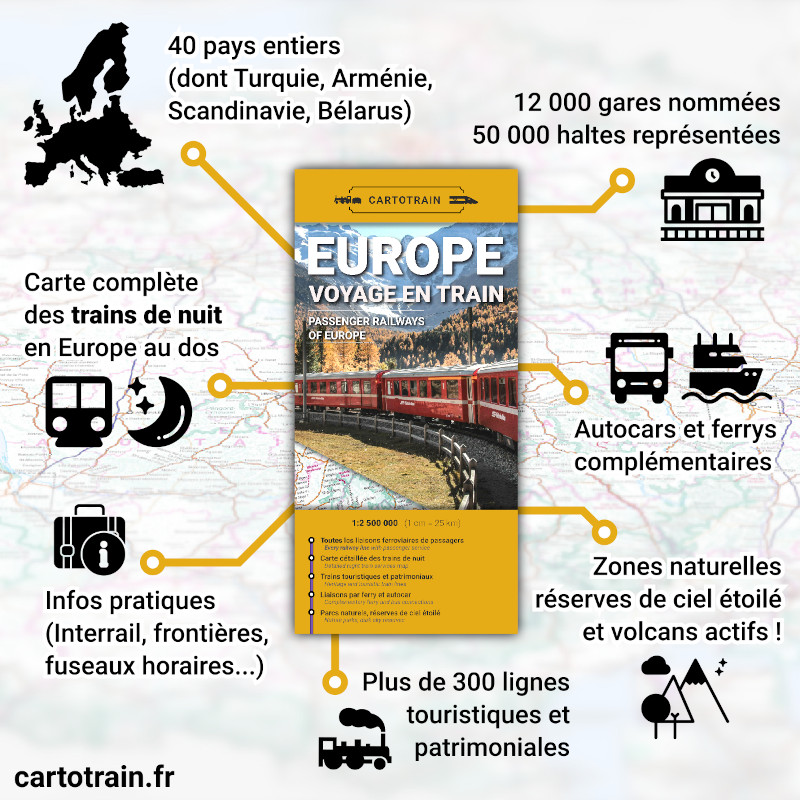 Op de achterkant van de kaart vind je een in kaart gebrachte inventaris van de nachttreinen in Europa!