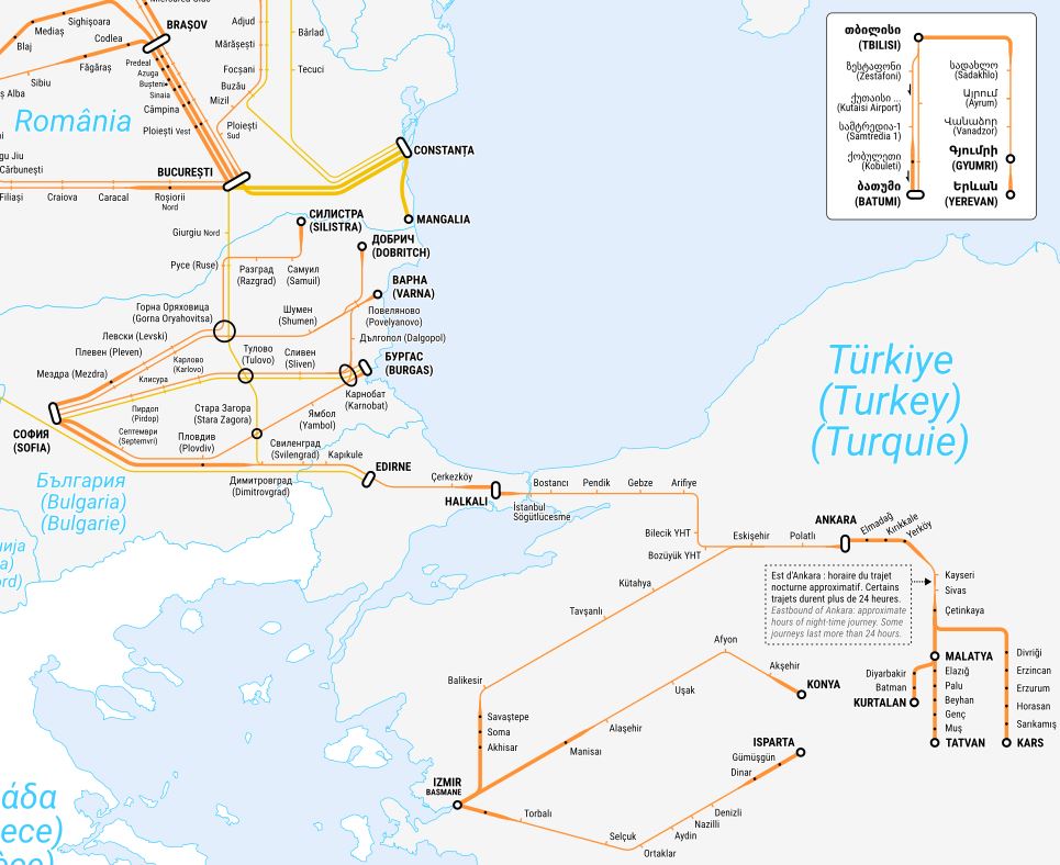 De kaart bevat ook veerdiensten, om je reis nog verder voort te zetten! Waar spoorverbindingen ontbreken, zijn enkele aanvullende buslijnen toegevoegd.