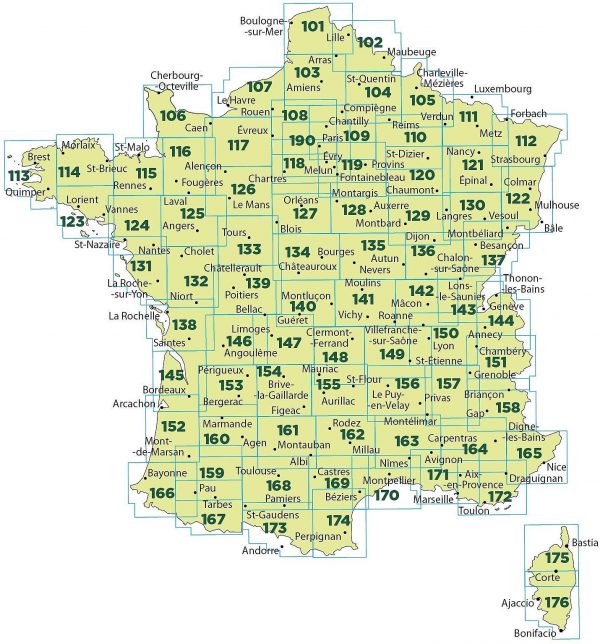 De ´Série Verte´ verdeelt Frankrijk in 76 mooie gedetailleerde kaarten op schaal 1:100.000. Deze schaal maakt het mogelijk veel details in het landschap te tonen, alle nederzettingen (tot en met de kleinste gehuchten), diverse vormen van grondgebruik, alle wegen tot en met de bredere onverharde paden. Deze kaarten stellen je dan ook in staat een goede indruk te krijgen van de omgeving. Als fietskaart zijn ze perfect. De voies vertes staan er ook op. Dit zijn oude spoorbanen en (jaag)paden langs kanalen en rivieren die omgetoverd zijn tot mooie vlakke en autovrije fietspaden. Je vindt ze overal in Frankrijk. Op dit moment heeft dat nog niet geleid tot één aaneensluitend netwerk van routes, maar her en der is toch al wel mogelijk om vele kilometers lang over een dergelijke traject te kunnen fietsen.