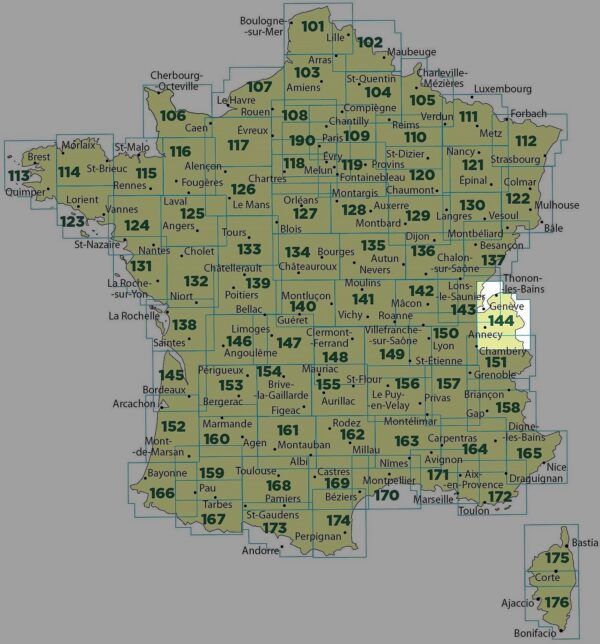 De ´Série Verte´ verdeelt Frankrijk in 76 mooie gedetailleerde kaarten op schaal 1:100.000. Deze schaal maakt het mogelijk veel details in het landschap te tonen, alle nederzettingen (tot en met de kleinste gehuchten), diverse vormen van grondgebruik, alle wegen tot en met de bredere onverharde paden. Deze kaarten stellen je dan ook in staat een goede indruk te krijgen van de omgeving. Als fietskaart zijn ze perfect. De voies vertes staan er ook op. Dit zijn oude spoorbanen en (jaag)paden langs kanalen en rivieren die omgetoverd zijn tot mooie vlakke en autovrije fietspaden. Je vindt ze overal in Frankrijk. Op dit moment heeft dat nog niet geleid tot één aaneensluitend netwerk van routes, maar her en der is toch al wel mogelijk om vele kilometers lang over een dergelijke traject te kunnen fietsen.