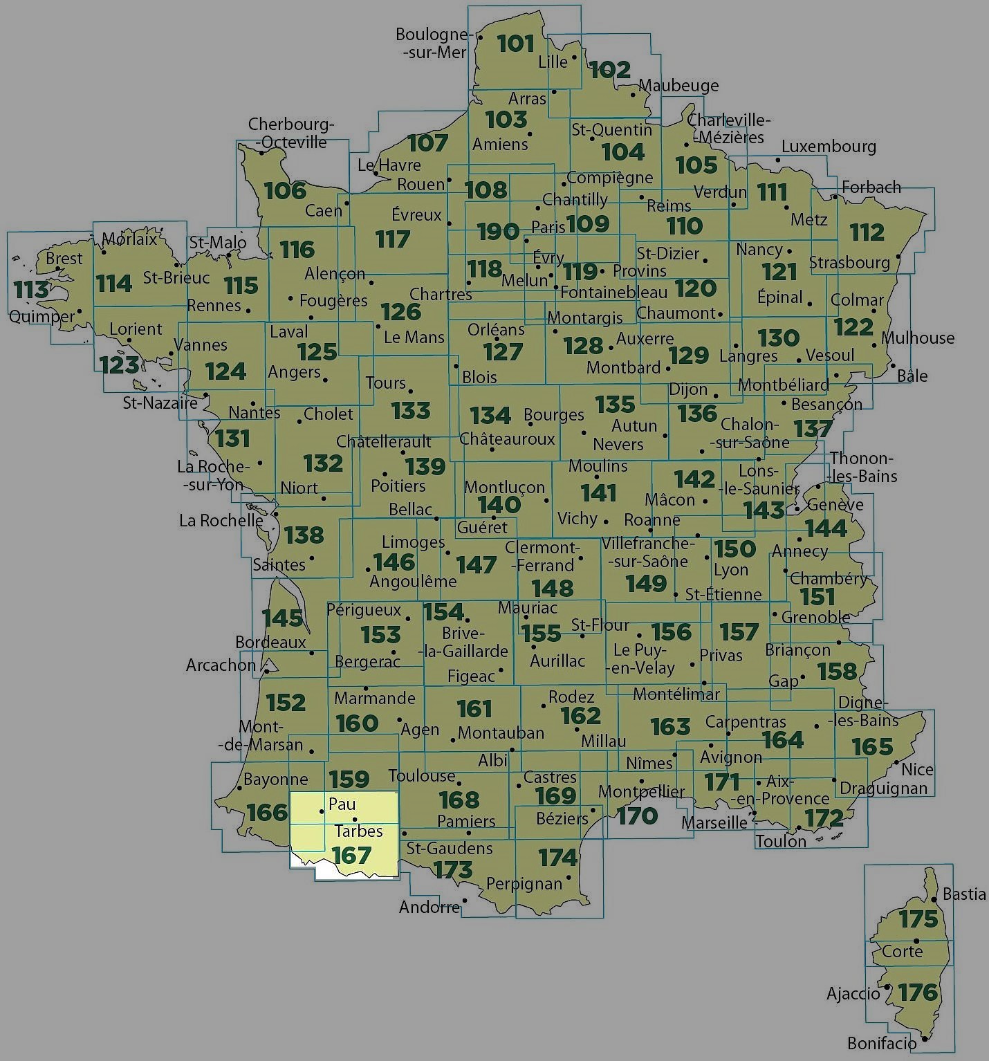 DE SÉRIE VERTE KAARTEN WORDEN GELEIDELIJK VERVANGEN DOOR DÉPARTEMENTSKAARTEN. De vervanger van deze kaart is: TCD-64 Pyrénées-Atlantiques, Pau maar de gebieden komen niet geheel overeen.
