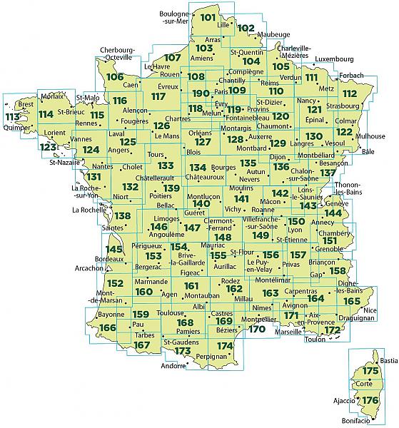 De ´Série Verte´ verdeelt Frankrijk in 76 mooie gedetailleerde kaarten op schaal 1:100.000. Deze schaal maakt het mogelijk veel details in het landschap te tonen, alle nederzettingen (tot en met de kleinste gehuchten), diverse vormen van grondgebruik, alle wegen tot en met de bredere onverharde paden. Deze kaarten stellen je dan ook in staat een goede indruk te krijgen van de omgeving. Als fietskaart zijn ze perfect. De voies vertes staan er ook op. Dit zijn oude spoorbanen en (jaag)paden langs kanalen en rivieren die omgetoverd zijn tot mooie vlakke en autovrije fietspaden. Je vindt ze overal in Frankrijk. Op dit moment heeft dat nog niet geleid tot één aaneensluitend netwerk van routes, maar her en der is toch al wel mogelijk om vele kilometers lang over een dergelijke traject te kunnen fietsen.