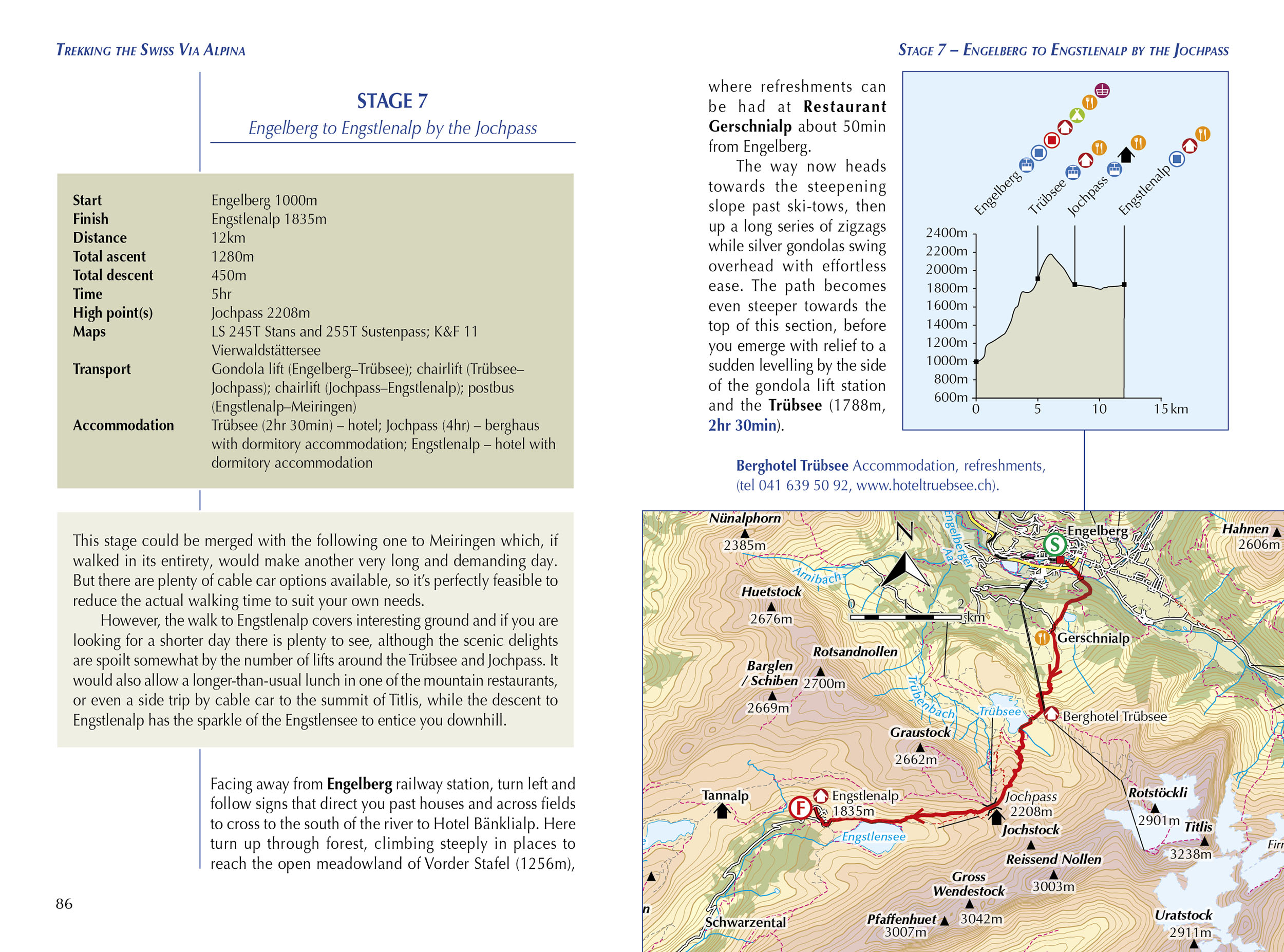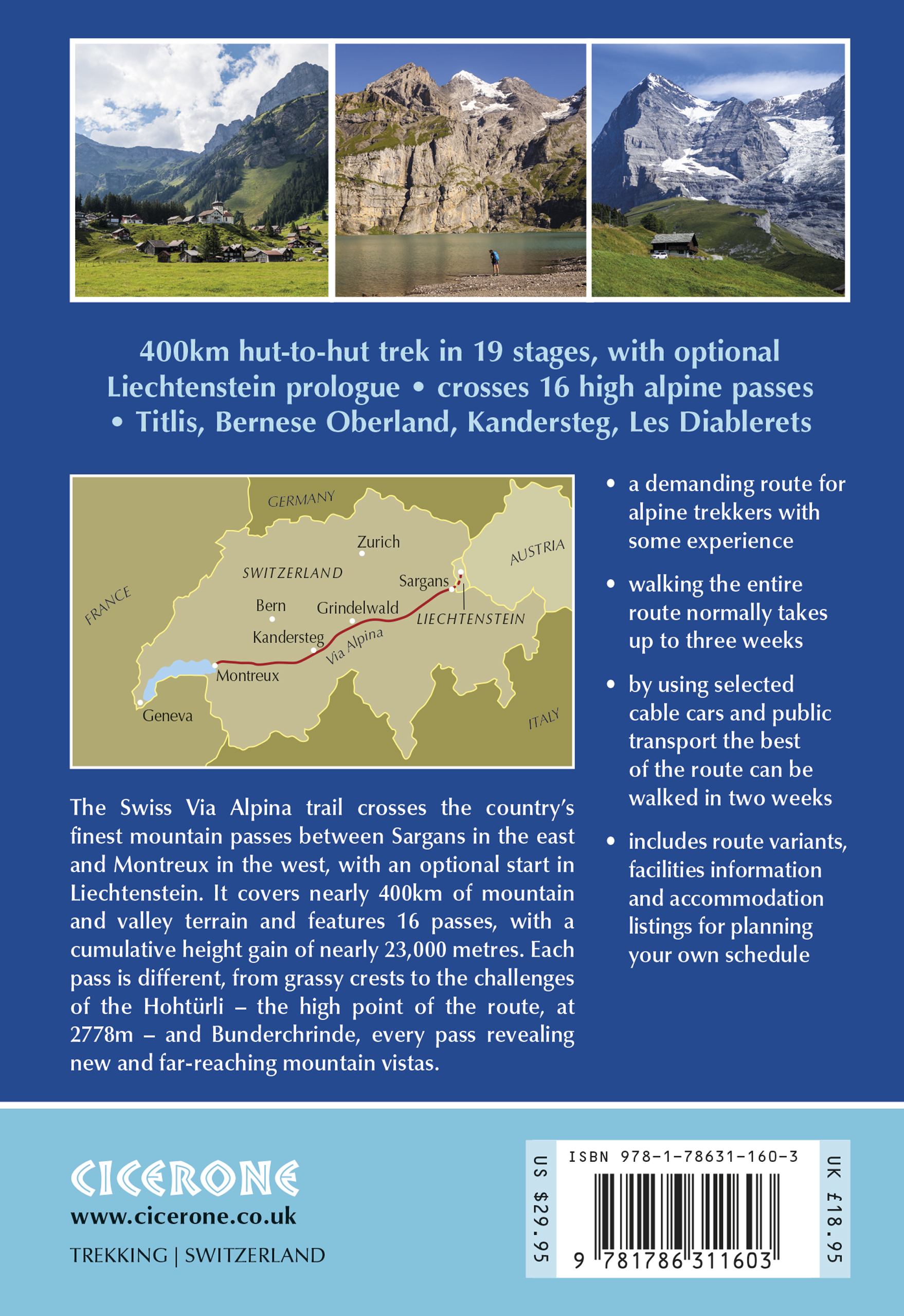 Deze gids presenteert de prachtige Alpine Pass Route, nu volledig gemarkeerd als Via Alpina 1. De 360 km lange route doorkruist Zwitserland van oost naar west, van Sargans bij de grens met Liechtenstein tot Montreux aan het Lac Léman (meer van Genève). Zestien Alpenpassen worden doorkruist en de route voert u door enkele van de meest adembenemende berglandschappen van het land, met uitzicht op iconische bergtoppen zoals de Wetterhorn, Eiger, Jungfrau en Les Diablerets. De route is geschikt voor mensen met enige ervaring op het gebied van alpiene trekking: de route vergt meer dan 20.000 hoogtemeters klimmen en bevat een aantal steile stukken. Het kan in 2-3 weken worden voltooid, hoewel het ook mogelijk is om kortere stukken te lopen, of er kunnen postbus-, kabelbaan- en spoorverbindingen worden gebruikt voor mensen die wat krapper in hun tijd zitten.Met een schat aan praktische adviezen en informatie over lokale bezienswaardigheden heeft de gids alles wat je nodig hebt om een succesvolle reis te plannen. De Via Alpina 1 wordt in 18 etappes gepresenteerd, elk met een stapsgewijze routebeschrijving en 1:100.000 kaarten, hoogteprofielen en details m.b.t. vervoer, accommodatie en faciliteiten. Daarnaast worden ook een 26 km lange proloog in Liechtenstein en een alternatieve finish volgens het oude parcours van de Alpenpasroute via Gsteig beschreven. De overnachtingsmogelijkheden variëren van berghutten tot hotels en herbergen, waarbij u kunt kamperen op een aantal plaatsen langs de route.