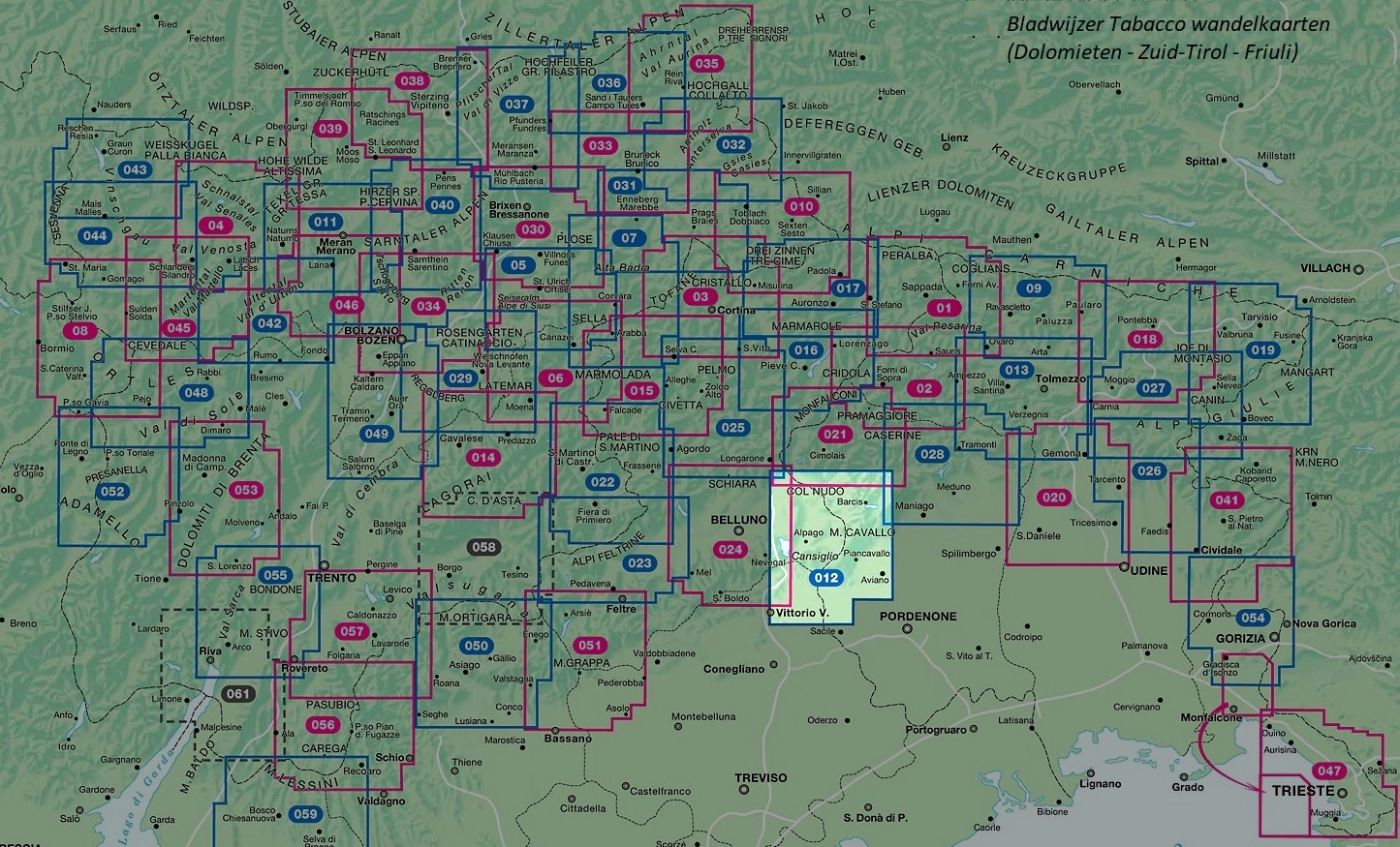 Kaarten en gidsen > Wandelen > Wandelkaarten > Europa > Zuid-Europa / Middellandse Zee > Italië > Noord-Italië > Veneto, Friuli > TAB-012 Cansiglio - Alpago - Piancavallo - Barcis | Tabacco wandelkaart