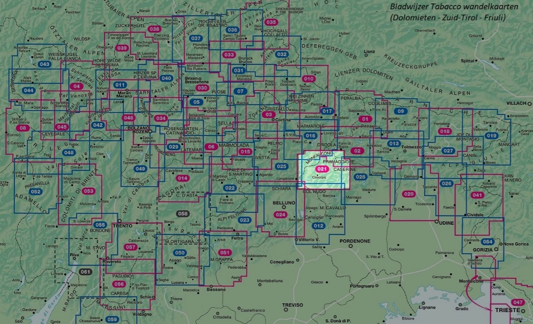 Kaarten en gidsen > Wandelen > Wandelkaarten > Europa > Zuid-Europa / Middellandse Zee > Italië > Noord-Italië > Veneto, Friuli > TAB-021 Dolomiti di Sinistra Piave | Tabacco wandelkaart