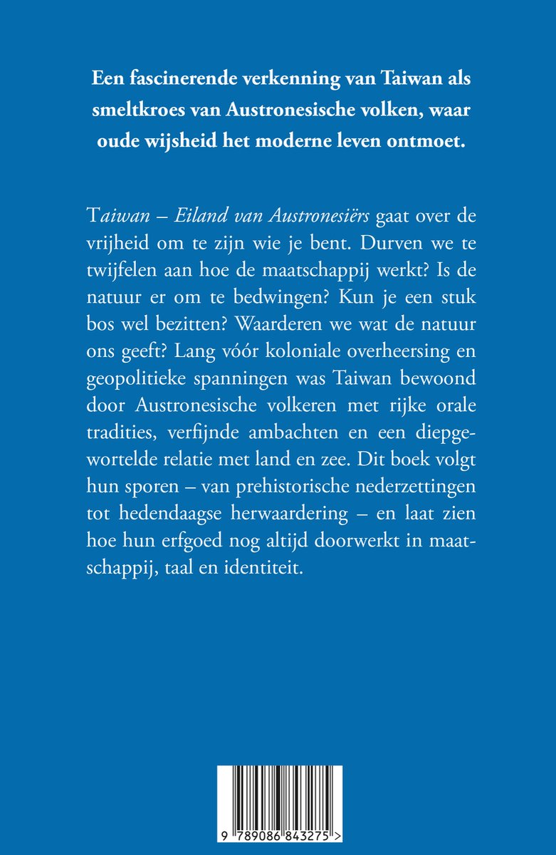 Taiwan - Eiland van Austronesiërs gaat over de vrijheid om te zijn wie je bent. Durven we te twijfelen aan hoe de maatschappij werkt? Is de natuur er om te bedwingen? Kun je een stuk bos wel bezitten? Waarderen we wat de natuur ons geeft? Lang vóór koloniale overheersing en geopolitieke spanningen was Taiwan bewoond door Austronesische volkeren met rijke orale tradities, verfijnde ambachten en een diepgewortelde relatie met land en zee. Dit boek volgt hun sporen - van prehistorische nederzettingen tot hedendaagse herwaardering - en laat zien hoe hun erfgoed nog altijd doorwerkt in maatschappij, taal en identiteit.