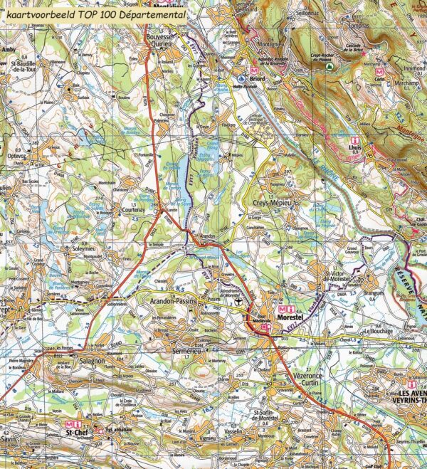 De serie Departementskaarten van het IGN zijn mooie gedetailleerde kaarten op schaal 1:100.000, ingedeeld per departement. Deze schaal maakt het mogelijk veel details in het landschap te tonen, alle nederzettingen (tot en met de kleinste gehuchten), diverse vormen van grondgebruik, alle wegen tot en met de bredere onverharde paden. Deze kaarten stellen je dan ook in staat een goede indruk te krijgen van de omgeving. Als fietskaart zijn ze perfect. De voies vertes staan er ook op. Dit zijn oude spoorbanen en (jaag)paden langs kanalen en rivieren die omgetoverd zijn tot mooie vlakke en autovrije fietspaden. Je vindt ze overal in Frankrijk. Op dit moment heeft dat nog niet geleid tot één aaneensluitend netwerk van routes, maar her en der is toch al wel mogelijk om vele kilometers lang over een dergelijke traject te kunnen fietsen.