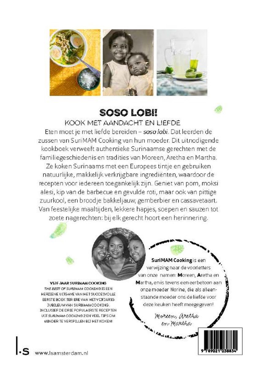 The best of SuriMAM Cooking is een tongstrelende hommage aan de Surinaamse eetcultuur en gerechten van de drie iconische zussen. Op veler verzoek komt nu de vijfjarige-jubileumeditie van SuriMAM Cooking. De zussen Waal vertellen hun tori: het verhaal over hun liefde voor koken. Ze nodigen je uit smakelijke Surinaamse gerechten te bereiden, en voeren je mee met de liefde en de saamhorigheid van de Surinaamse cultuur. Met tongstrelende klassiekers zoals pom, gevulde roti, gele pesiesoep, tomtom van bananen en natuurlijk gemberbier. Een uitnodigende verzameling van de lekkerste recepten en de belangrijkste culinaire gebruiken uit Suriname met aandacht voor verspillingsvrij koken. SuriMAM Cooking is een verwijzing naar de voorletters van Moreen, Aretha en Martha, en is tevens een eerbetoon aan hun moeder Norine. Zij heeft als alleenstaande moeder hun de liefde voor de Surinaamse keuken meegegeven.