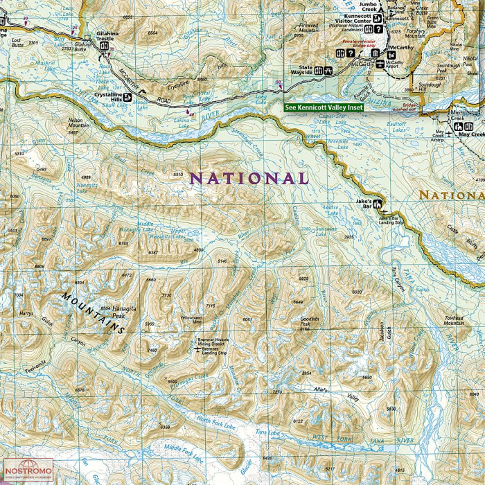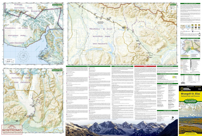 Arrive in the area using one of only two paved roads or use the mapped landing areas, seaplane bases and anchorage sites and continue your exploration with mapped hiking trails and primitive routes. Two insets show detailed access to the Kennicott Valley and Nabesna. Explore the backcountry using the map's contour lines, elevations, labeled peaks and summits, water features, selected waypoints, areas of wooded cover and color-coded boundaries between different land designations. Other recreation and adventure points of interest include ranger stations, campgrounds, trail shelters, public cabins, restrooms and scenic viewpoints. Some additional map features are background information of the various public lands in the area, wilderness safety tips, bear encounter guidelines and essential contact information.