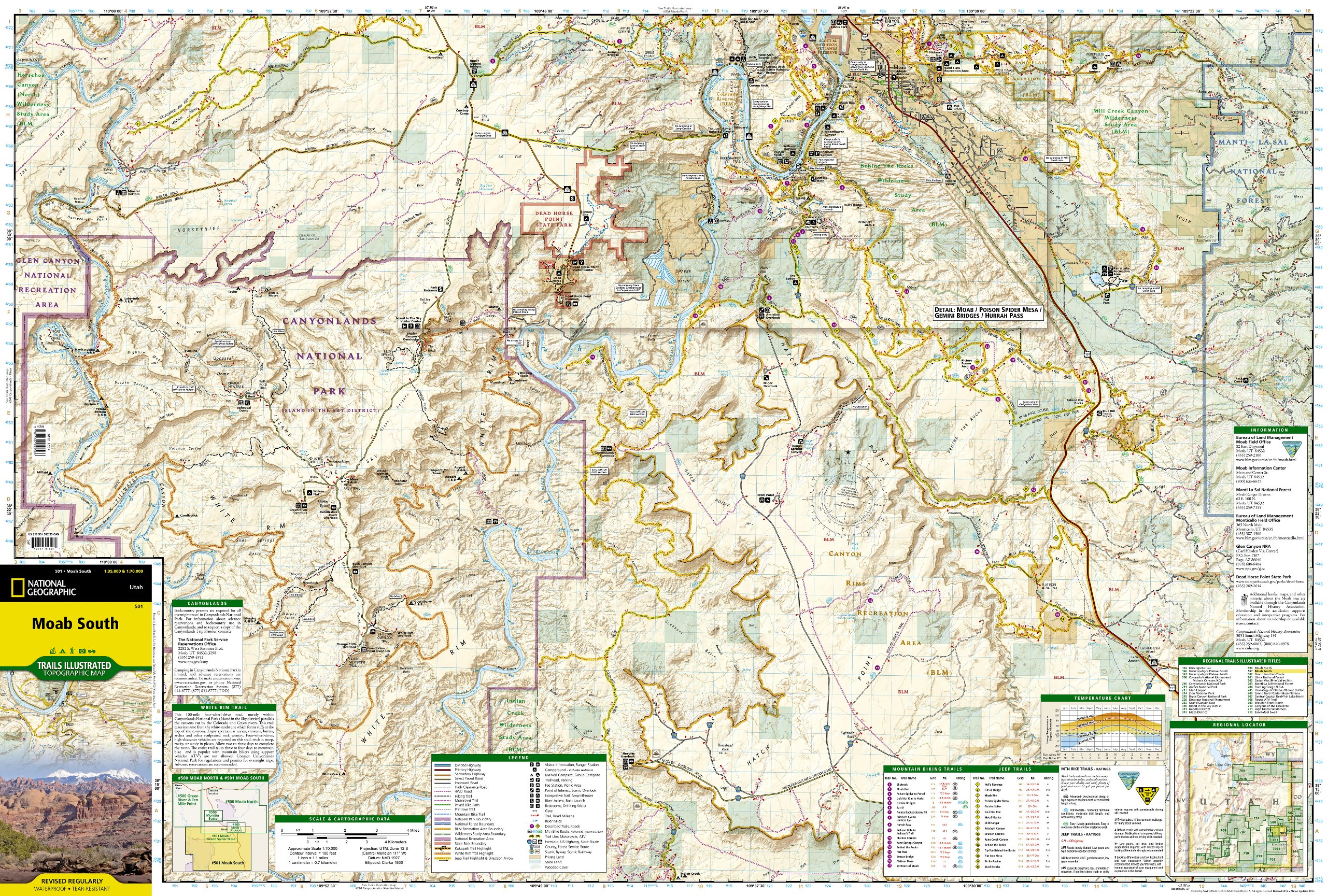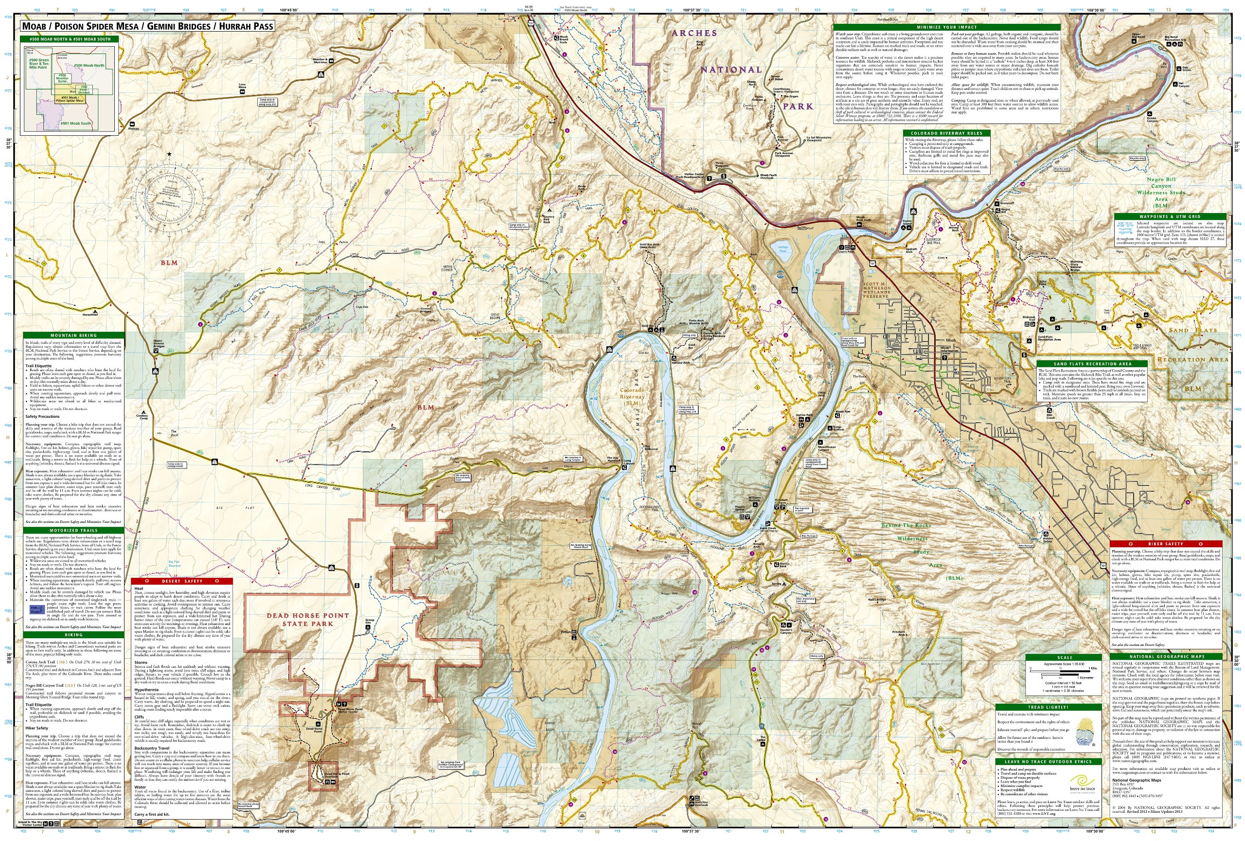 Of uw favoriete manier van vervoer door deze wildernis nu een mountainbike, wildwaterraft, ATV, Jeep of uw eigen twee voeten is, u zult de ongeëvenaarde details en nuttige informatie op deze kaart waarderen. De (dubbelzijdige en weersbestendige) kaart bevat Canyonlands National Park, Dead Horse Point State Park, Canyon Rims en Canyon Rims en Sand Flats recreatiegebieden, evenals details van de Moab / Poison Spider Mesa / Gemini Bridges / Hurrah Pass gebied. Bijzondere aandacht wordt besteed aan de uitgebreide wandelpaden in het gebied. Informatie over mountainbike en Jeep trails, inclusief de schilderachtige White Rim Trail omvat hun moeilijkheidsgraad, afstand in km en exacte locatie. Een lijst van populaire wandelpaden is inbegrepen, en het westelijke deel van Kokopelli's Trail dat de regio doorkruist is gemarkeerd. Trail gebruik en kilometers tussen de kruispunten zijn duidelijk gemarkeerd. Rivierkilometers op de Colorado en groene rivieren staan ook vermeld, voor degenen die met de boot op verkenning gaan. De basis van de kaart bevat contourlijnen en markeringen voor toppen en passen. Enkele van de vele recreatiemogelijkheden zijn onder andere campings, wandelpaden, riviertoegangen, bootlanceringen, amfitheaters, en schilderachtige vergezichten. Een volledig UTM-raster is op de kaart afgedrukt om de GPS-navigatie te vergemakkelijken.