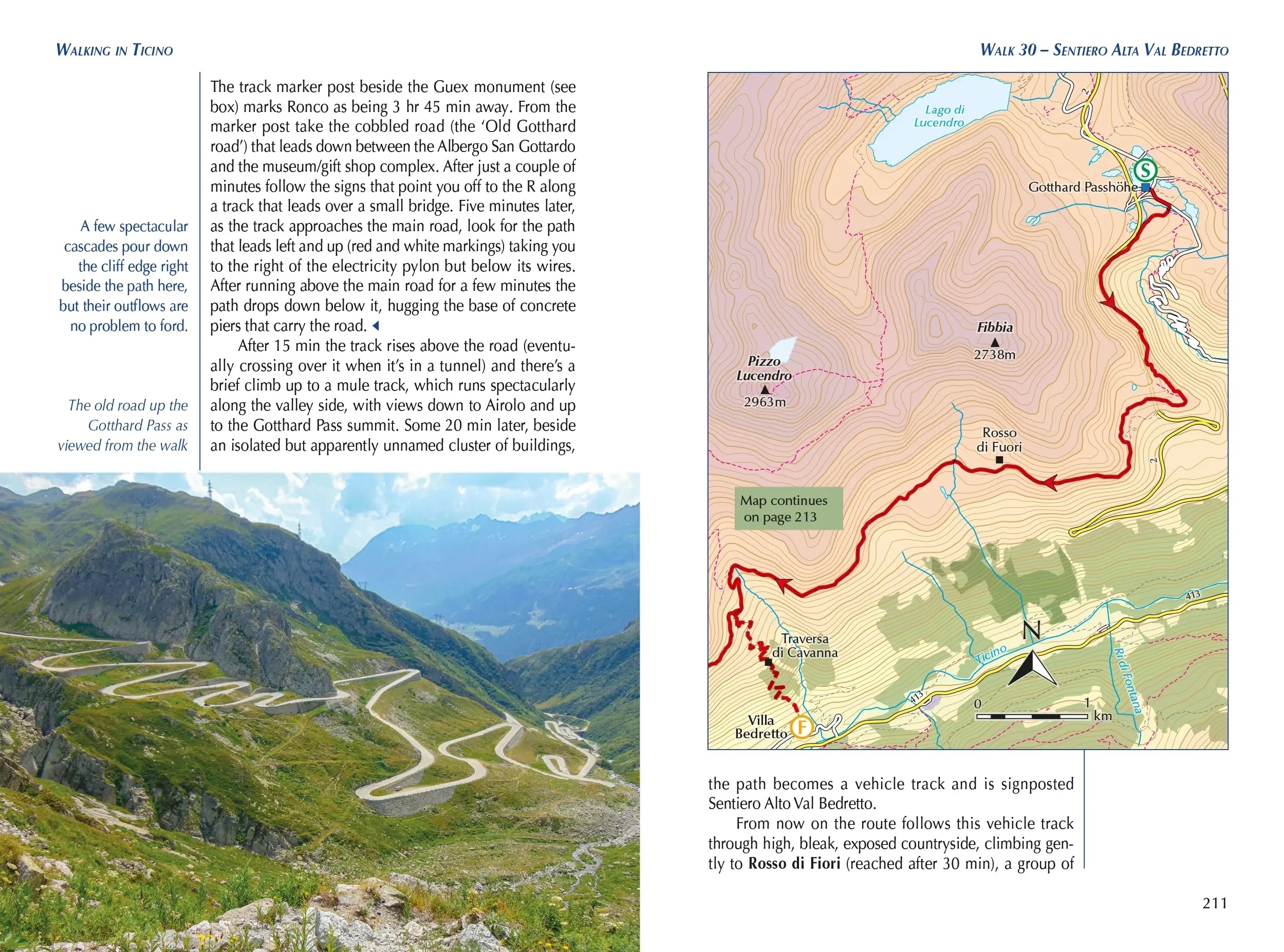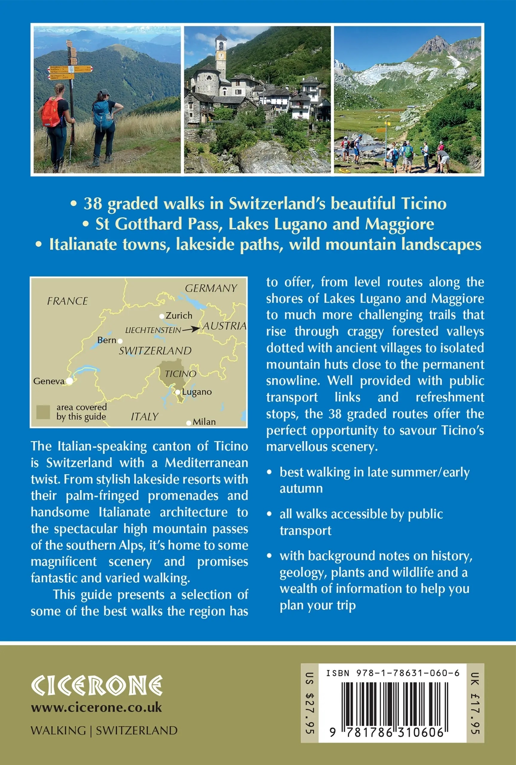 Guide to 38 graded day walks in Ticino, Switzerland, covering Lugano, Locarno (Lake Maggiore), Bellinzona and Biasca, and Airolo and the St Gotthard Pass. Routes for all abilities, ranging from 4km to 19km, highlight the best the Ticino countryside has to offer, from villages and lush valleys, to stunning mountains and gushing waterfalls.