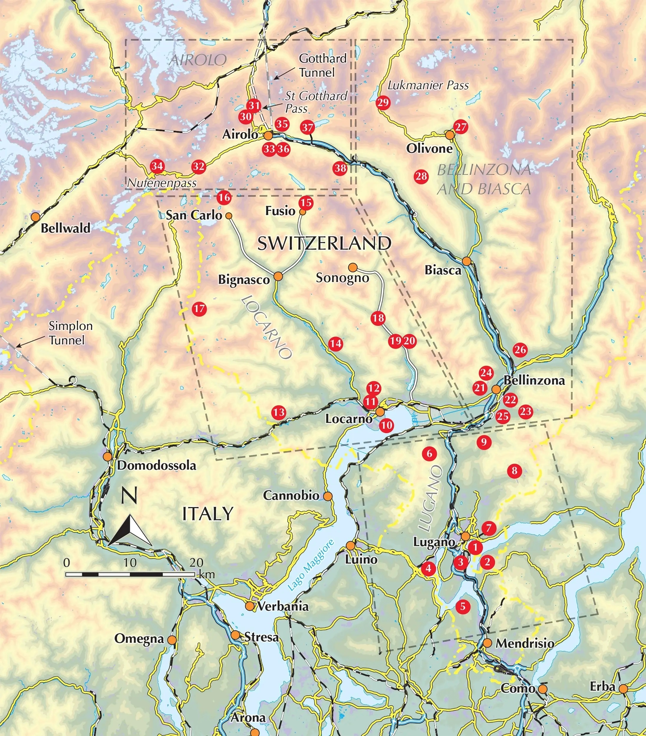 Ticino features the five main areas of lakeside resorts Lugano and Locarno; the Cantonal capital Bellinzona, and its neighbour Biasca; and Airolo, at the foot of the St Gotthard Pass.