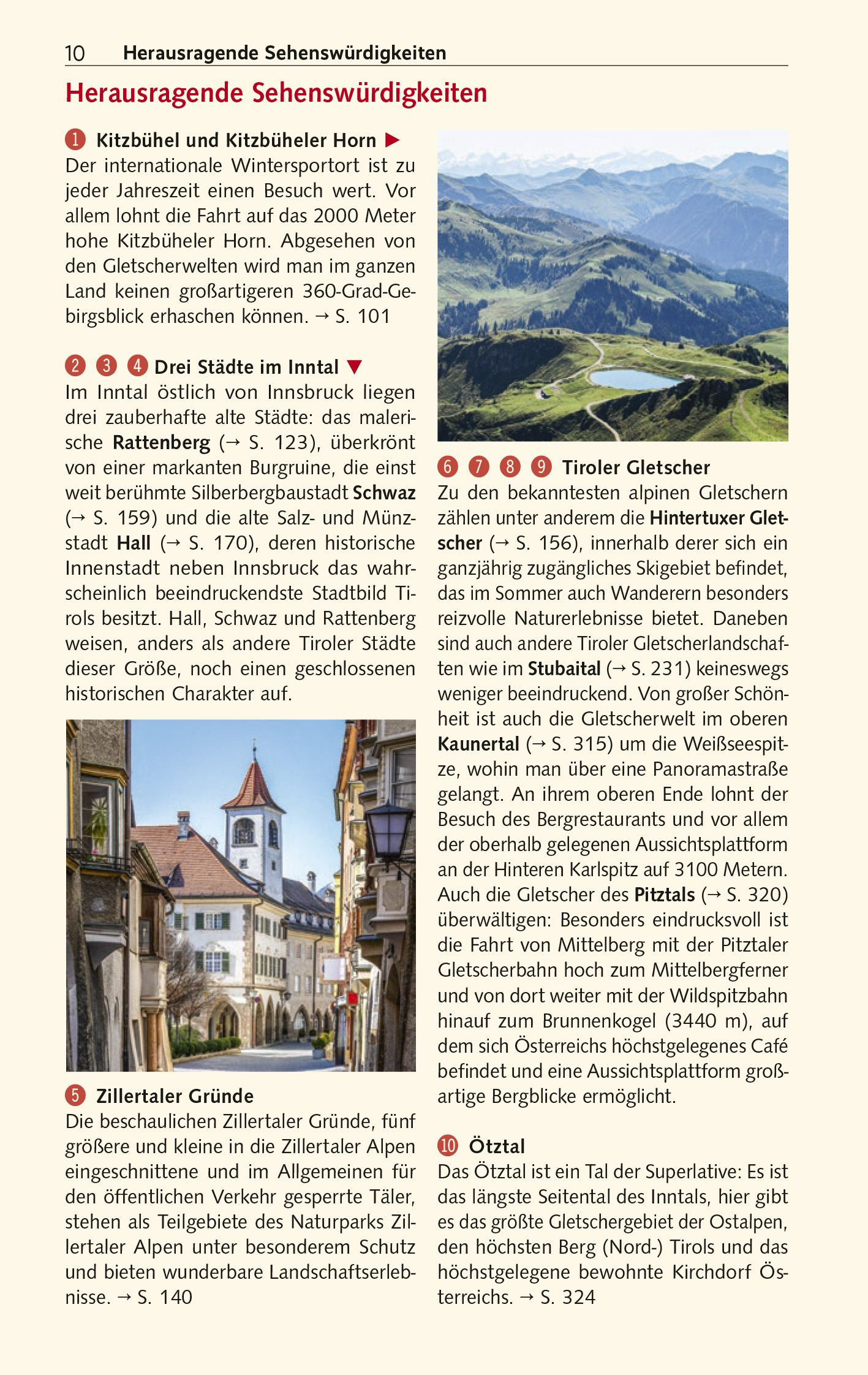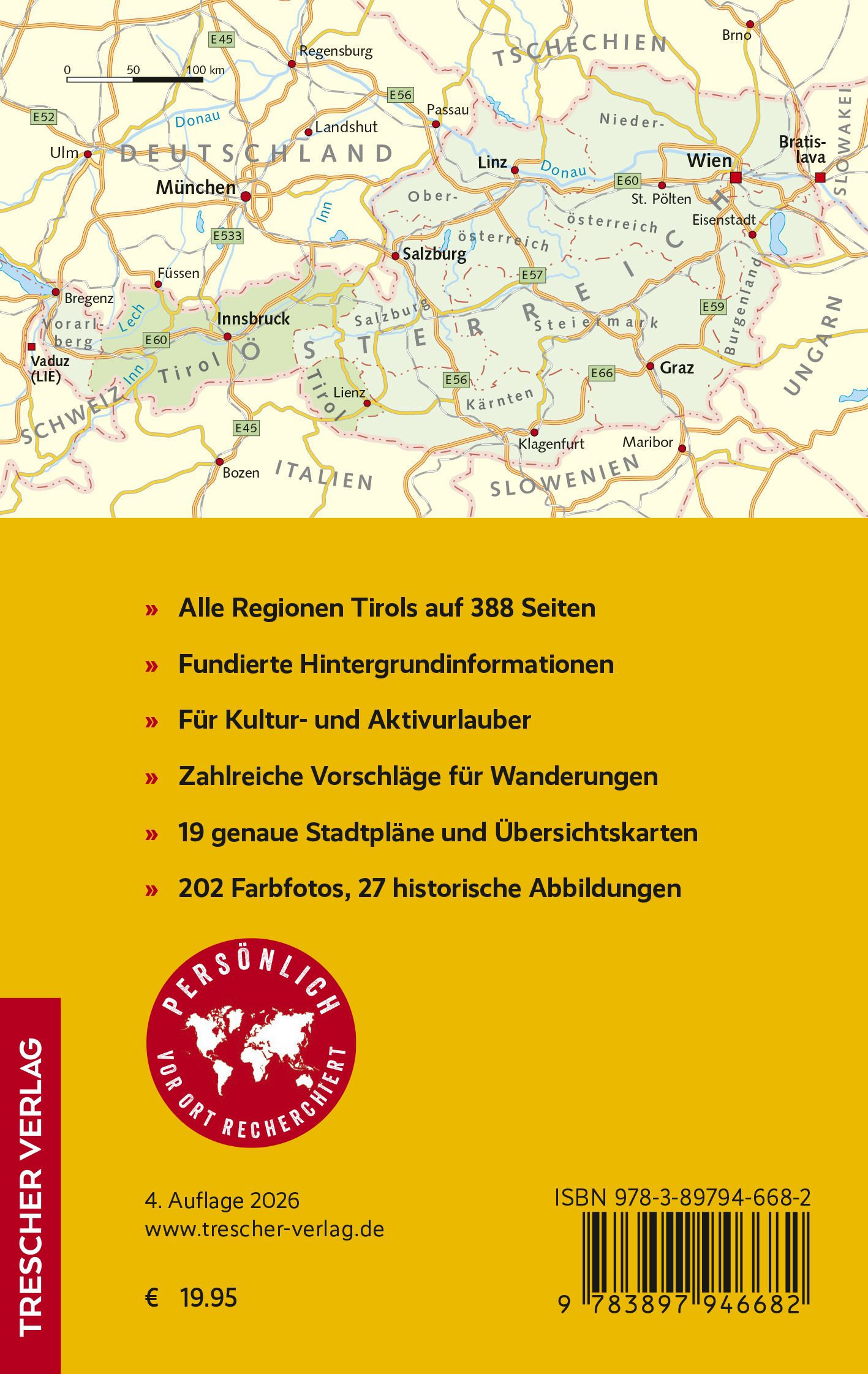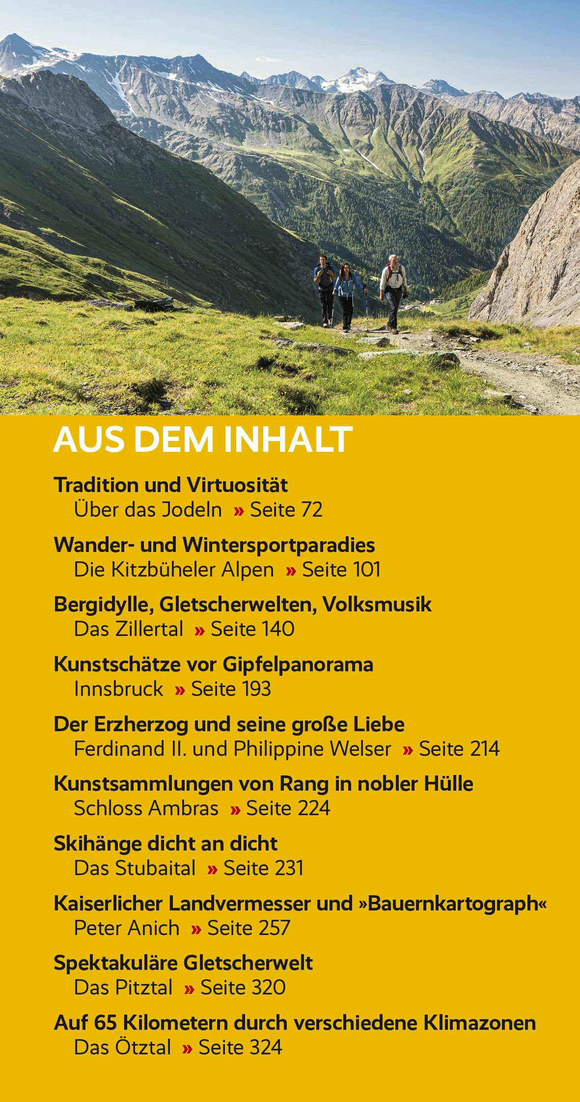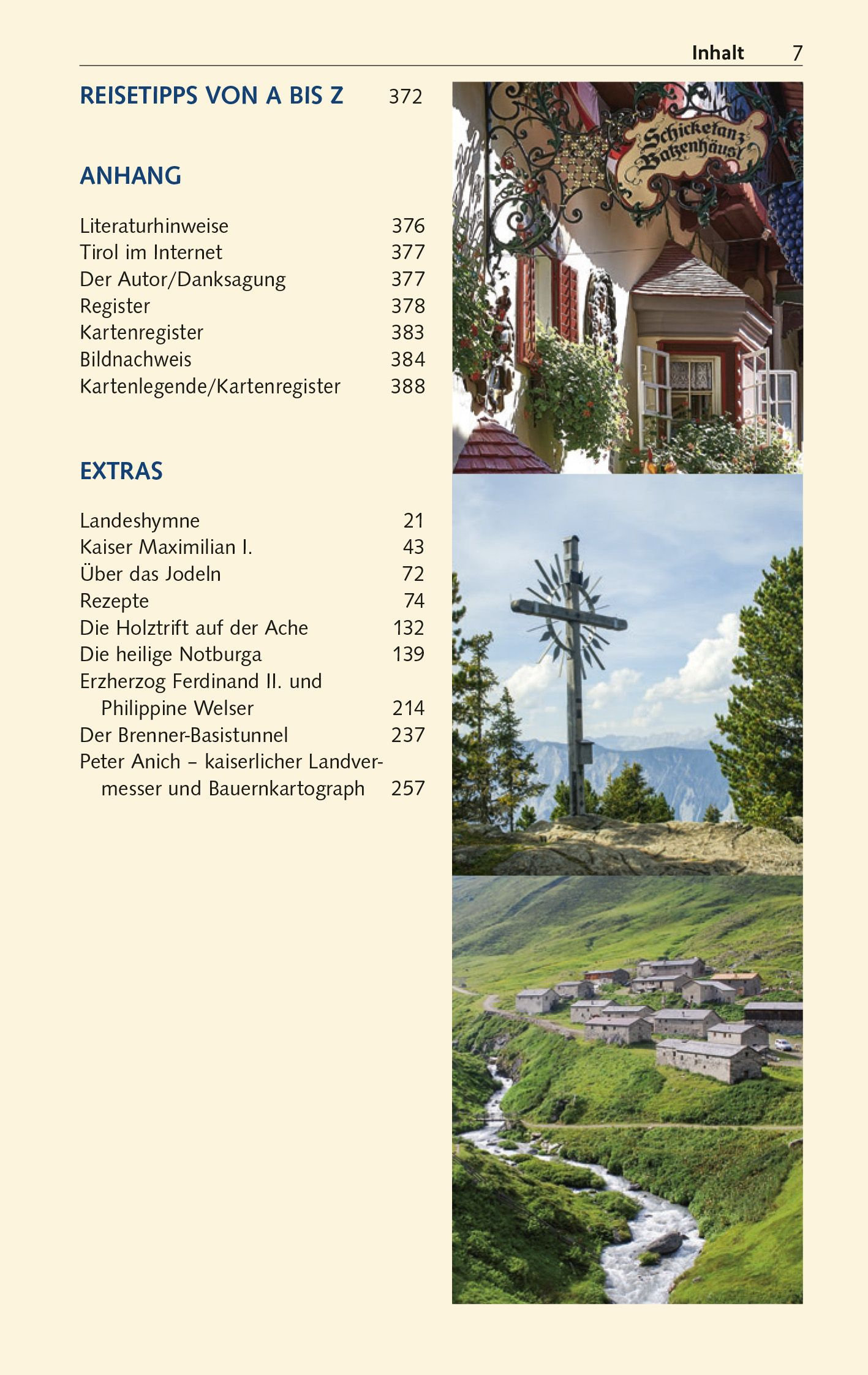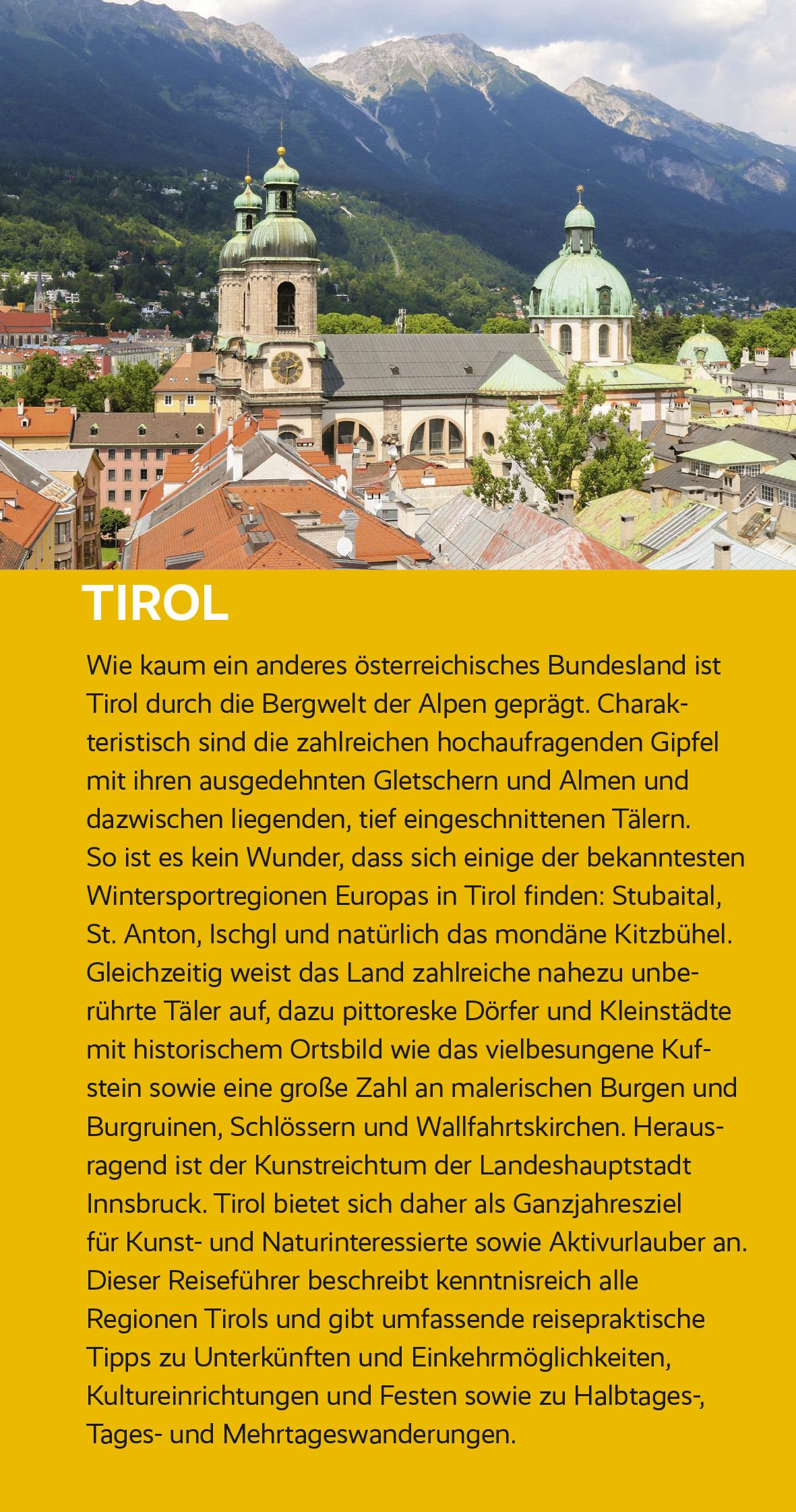Alle Regionen Tirols auf 348 Seiten - Fundierte Hintergrundinformationen - Für Kultur- und Aktivurlauber - Zahlreiche Vorschläge für Wanderungen - 20 genaue Stadtpläne und Übersichtskarten - 18 Farbfotos, 26 historische Abbildungen - - -Mit mehr als 42 Millionen Übernachtungen ist Tirol das mit Abstand beliebteste Reiseziel in den Alpen. Deutschsprachige Besucher stellen dabei die größte Gruppe an Reisenden. Natürlich ist Tirol für die Bergwelt der Alpen mit hochaufragenden Gipfeln, ausgedehnten Gletschern und Almen sowie die dazwischen liegenden, tief eingeschnittenen und teils unberührten Täler bekannt. Sehenswert sind aber auch die pittoresken Dörfer und Kleinstädte mit historischem Ortsbild wie das vielbesungene Kufstein. In die Landschaft eingestreut liegen eine große Zahl malerischer Burgen und Burgruinen, Schlösser und Wallfahrtskirchen. Von überregionaler Bedeutung sind Kunst und Kultur der sehr sehenswerten Landeshauptstadt Innsbruck.Tirol bietet sich als Ganzjahresziel für Kunst- und Naturinteressierte sowie für Aktivurlauber an. Dieser Reiseführer beschreibt alle Reiseziele zwischen Landeck, Kufstein, Innsbruck, Kitzbühel und Lienz. Dank vieler reisepraktischer Tipps eignet sich der Reiseführer perfekt für die Reisevorbereitung und für die Orientierung vor Ort.