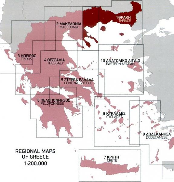 Thrace and Eastern Macedonia at 1:200,000 in a series of regional road maps of Greece from Terrain Editions, printed on light, waterproof and tear-resistant synthetic paper. The map is double-sided, with a small overlap between the sides, and included the islands of Thasos and Samothrace (Samothraki) as well as part of the Khalkidhiki Peninsula with Mt Athos and Sithonia. Topography is shown by relief shading with light altitude colouring and plenty of names of mountain ranges. All place names are in both Greek and Latin alphabets. Presentation of the road network differentiates between smooth and rough dirt roads, and shows driving distances on many local roads plus locations of petrol stations. Scenic routes are highlighted. Railway lines and ferry routes are included. A range of symbols indicate various places of interest including campsites and mountain refuges, archaeological sites, churches and monasteries, skiing areas, etc. The map has a 10km UTM grid.