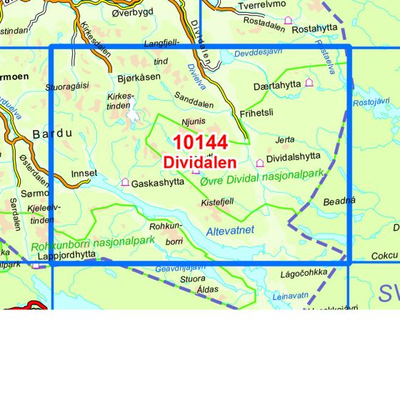 Kaarten en gidsen > Wandelen > Wandelkaarten > Europa > Scandinavië (& Noordpool) > Noorwegen > Noors Lapland > Topografische wandelkaart 10144 Dividalen 1:50.000