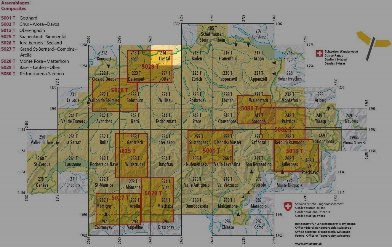 Topografische wandelkaart. Speciale versie van de Landeskarten der Schweiz 1:50.000, met opdruk van wandelroutes (rood aangegeven). Zeer nauwkeurige en betrouwbare cartografie. Het zijn met voorsprong de beste wandelkaarten die - op deze schaal - in Zwitserland worden gemaakt.