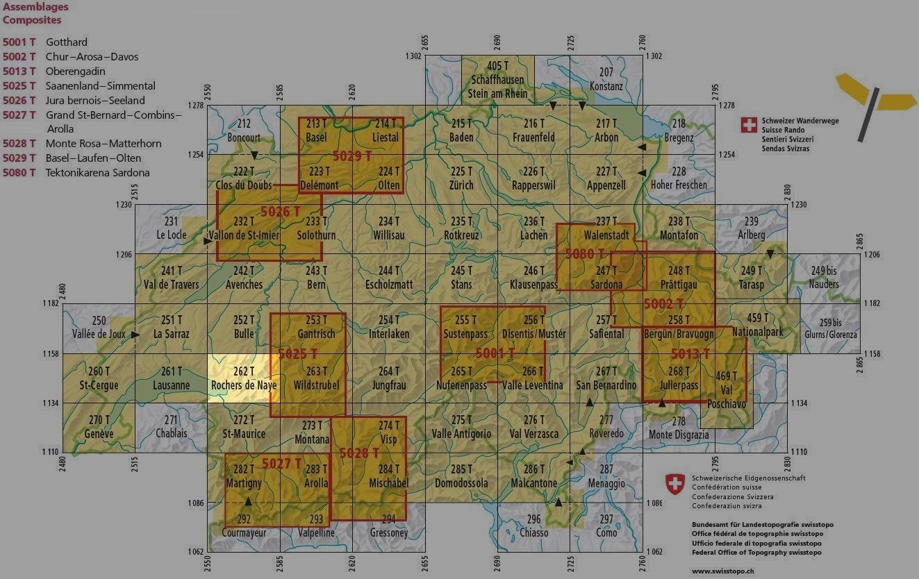 Topografische wandelkaart. Speciale versie van de Landeskarten der Schweiz 1:50.000, met opdruk van wandelroutes (rood aangegeven). Zeer nauwkeurige en betrouwbare cartografie. Het zijn met voorsprong de beste wandelkaarten die - op deze schaal - in Zwitserland worden gemaakt.