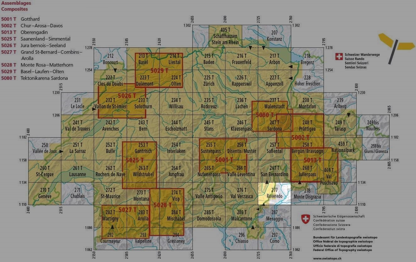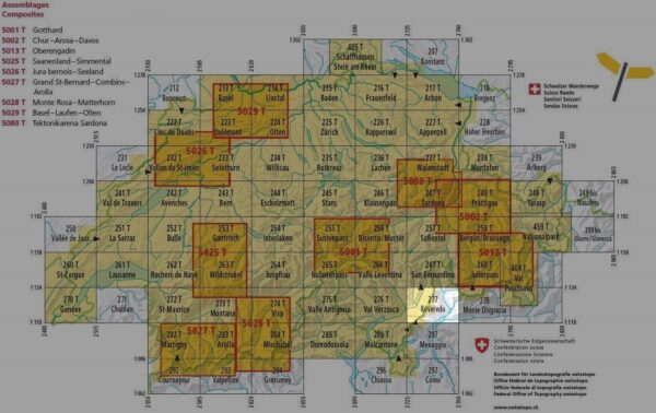 Topografische wandelkaart. Speciale versie van de Landeskarten der Schweiz 1:50.000, met opdruk van wandelroutes (rood aangegeven). Zeer nauwkeurige en betrouwbare cartografie. Het zijn met voorsprong de beste wandelkaarten die - op deze schaal - in Zwitserland worden gemaakt.