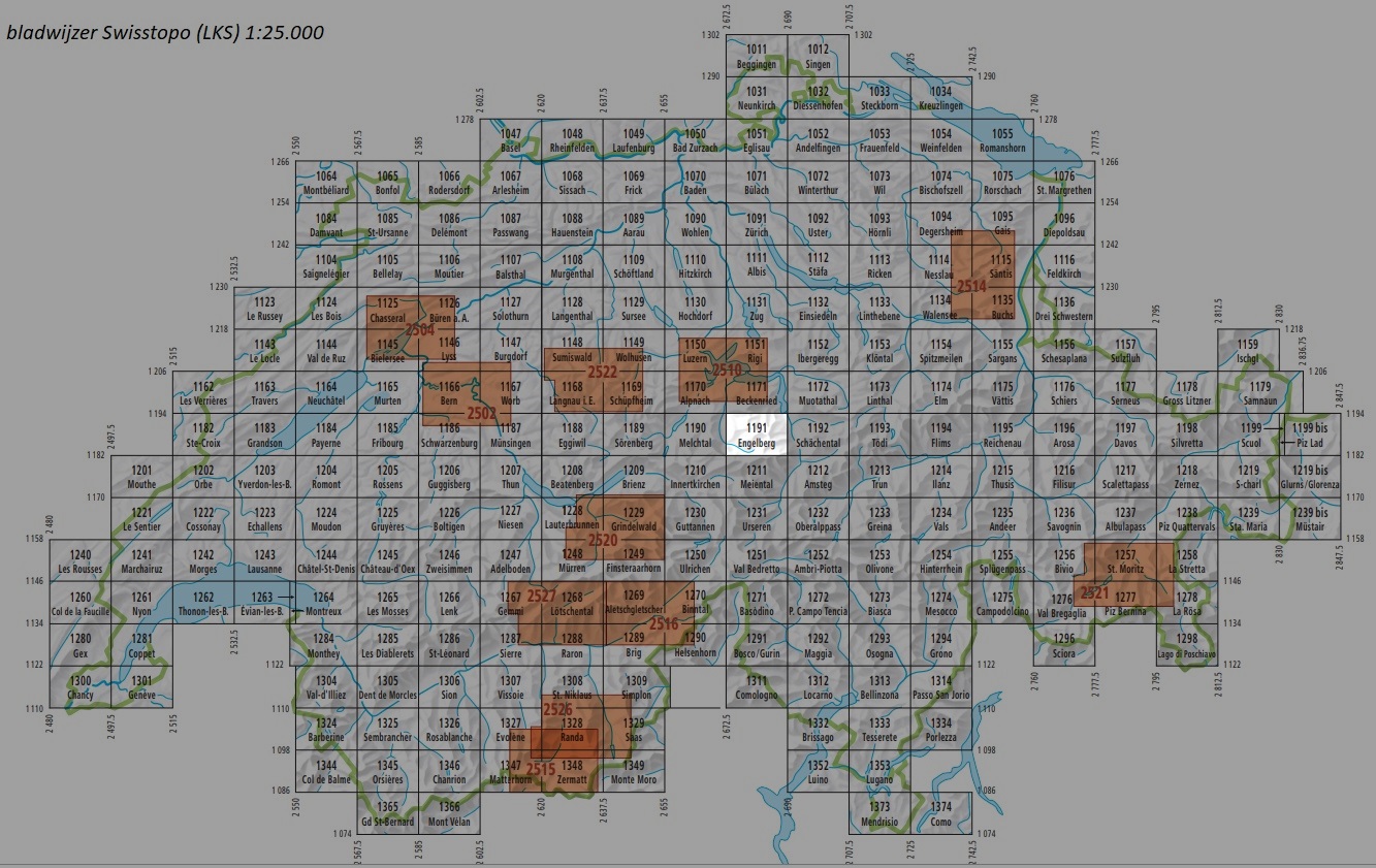 Topografische wandelkaarten van Zwitserland (Landeskarten der Schweiz), schaal 1:25.000. Kwalitatief zeer goed. Leent zich uitstekend voor het maken van wandeltochten en klimtochten, ook in hoog alpien terrein. Let wel, alle paden staan erop, maar géén gemarkeerde routes. Voor dat doel is met name de serie T-SERIE uitgegeven. Niettemin zijn deze 1:25.000 kaarten - wegens de sublieme cartografie en detaillering - perfecte wandelkaarten. De kaart zit in een door ons toegevoegd soepel transparant hoesje, ook handig tijdens het wandelen. | TIP: als je op de serienaam klikt verschijnen alle kaarten uit deze reeks, van deze regio, op nummervolgorde.