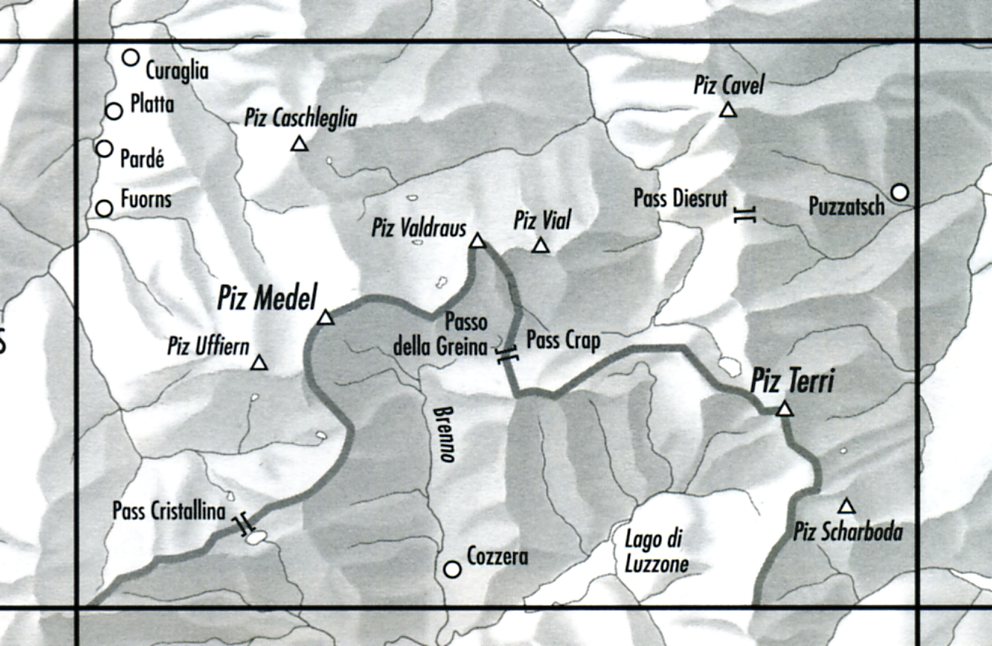 wandelkaart Pass Crap,Pass Diesrut, Piz Terri, Piz Cavel, Pass Cristallina